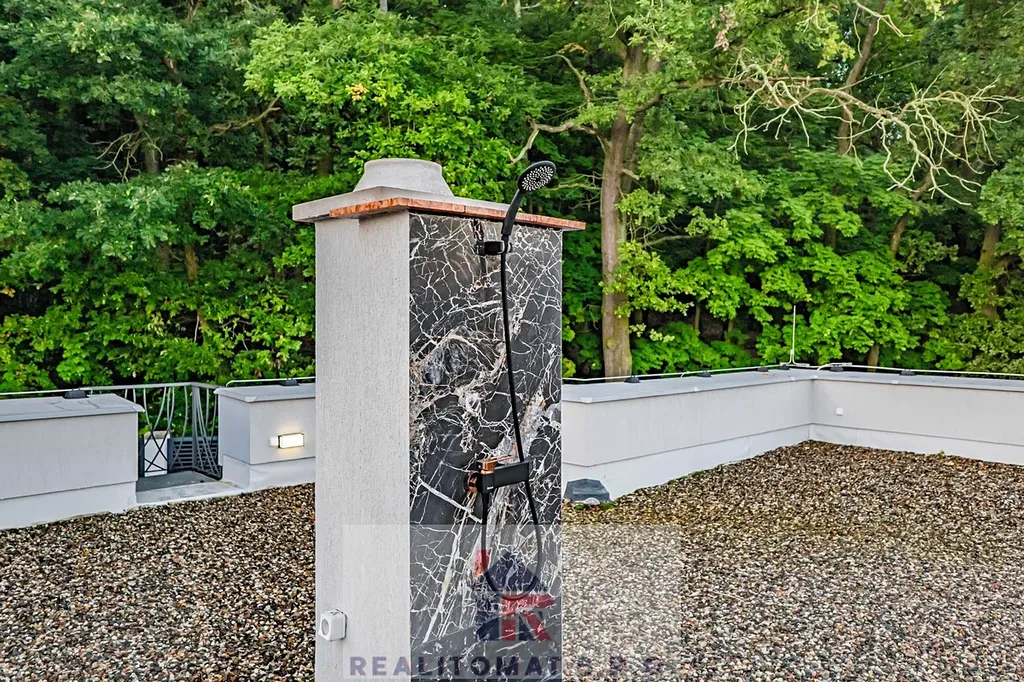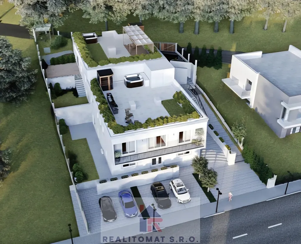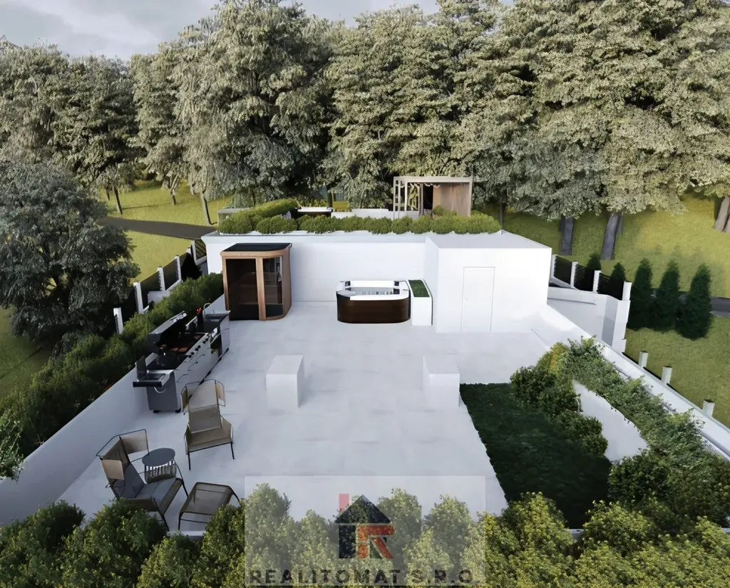 Na střeše rezidence jsou připravené terasy pro instalaci vířivek a saun. V zadní části domu je zastřešená pergola s přípravou na kuchyňskou linku.