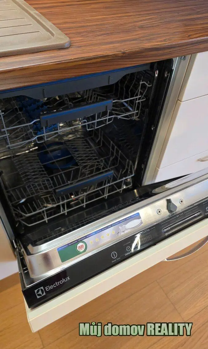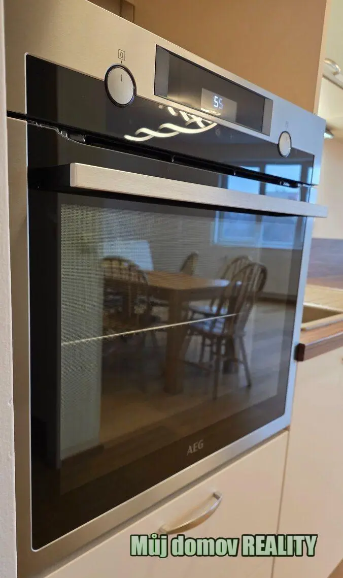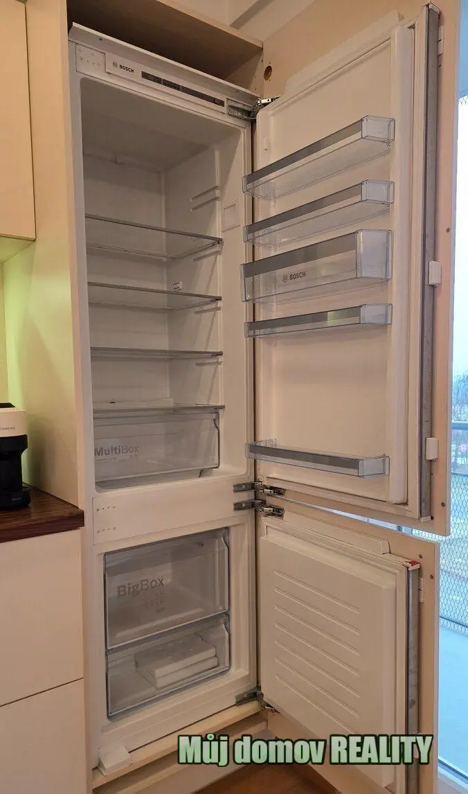Byt je vybaven **kvalitní kuchyňskou linkou se spotřebiči**, dřevěnými podlahami, **velkou vestavěnou šatní skříní**, samostatnou skříní na boty a dostatkem úložných prostor.