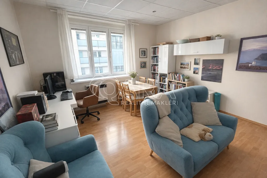 Dispozice: vstupní chodba s menším kuchyňským koutem, prostorný obývací pokoj s jídelní částí, ložnice, menší komora, koupelna s vanou a WC, součástí nájmu je také sklepní kóje.