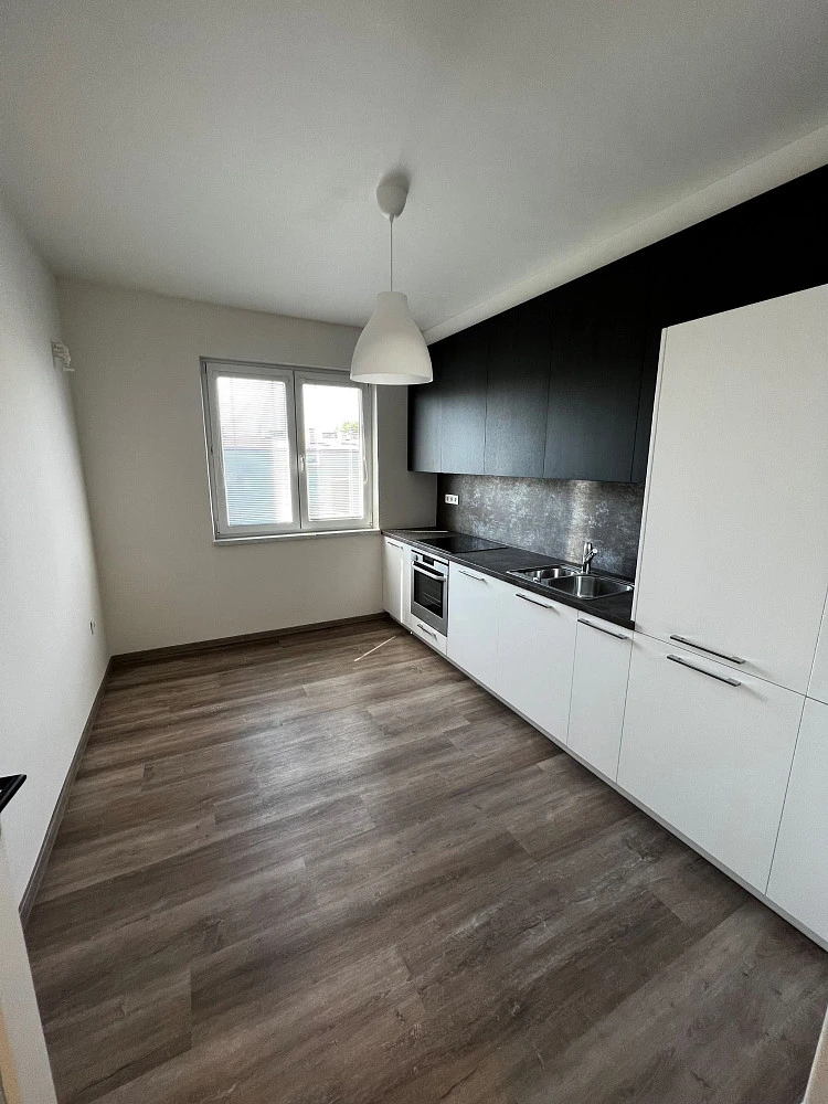 Kuchyně je vybavena moderní kuchyňskou linkou od společnosti HANÁK NÁBYTEK, která je řešena od podlahy až ke stropu. Jedná se o lakovanou kuchyni v kombinaci s dřevodekorem dub karbon. Kuchyně je vybavena indukční varnou deskou, digestoří s odtahem mimo byt, horkovzdušnou troubou s grilem, myčkou nádobí o rozměru 60 cm, vestavěnou lednicí s mrazákem, potravinovou skříní a prostornými horními skříněmi až ke stropu. Horní skříně jsou osazeny liniovým LED osvětlením a je tak zajištěno nasvětlení celé pracovní plochy. Rozsvícení světel je bezdotykové pomocí senzoru.