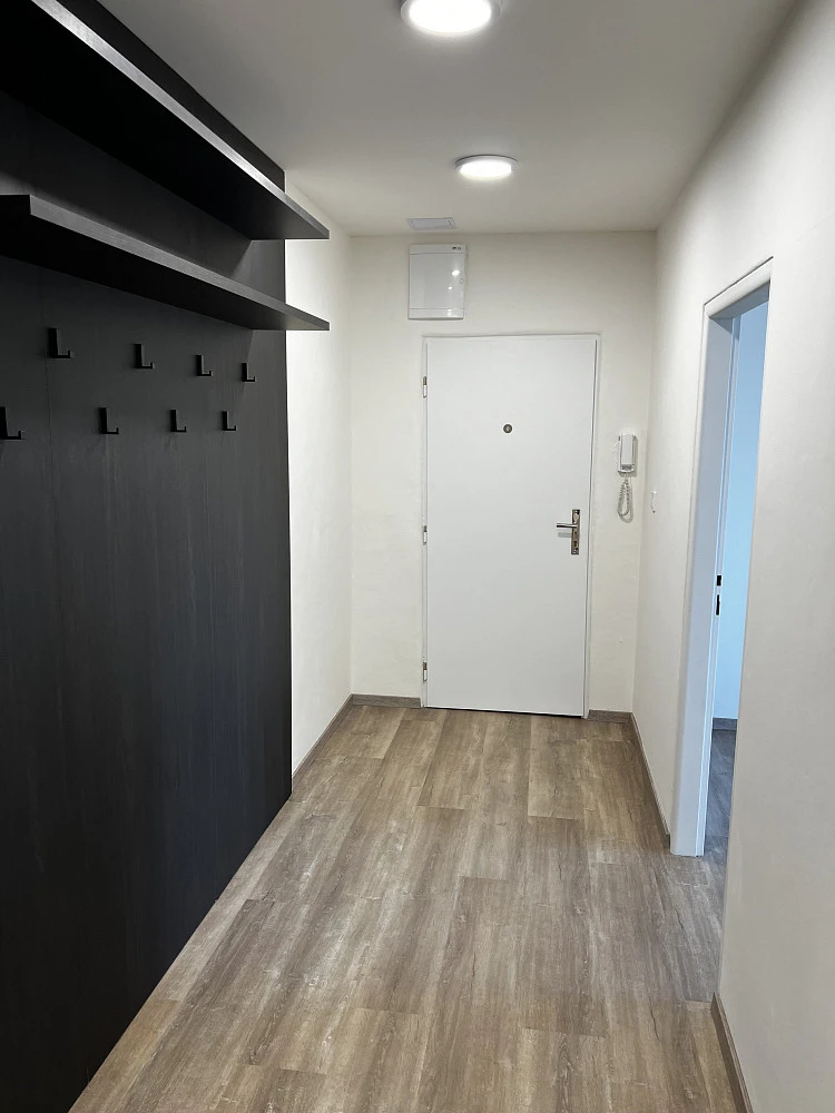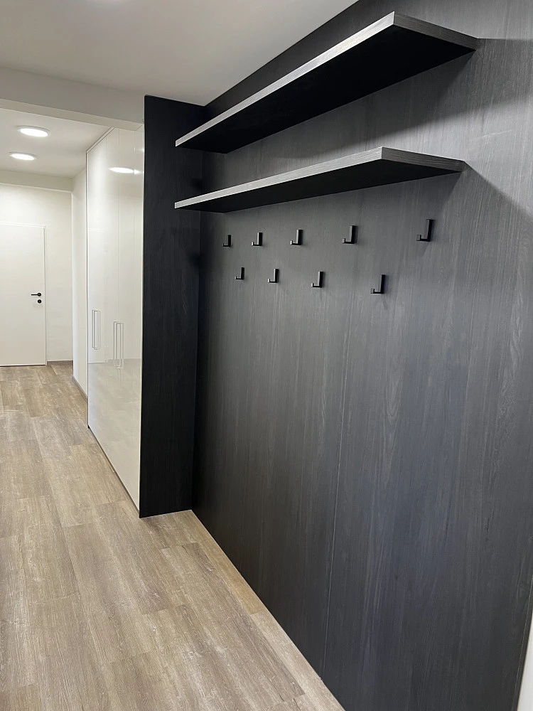 Vstupní chodba je vybavena krásnými vestavěnými skříněmi a věšákovou stěnou s policemi od prestižního výrobce nábytku, společnosti HANÁK NÁBYTEK. V chodbě je spoustu prostoru na odložení si věcí při vstupu do bytu, stejně tak prostorné vestavěné skříně umožňují uložení sezonních i pravidelně používaných věcí. Celá chodba je skvěle nasvícena.