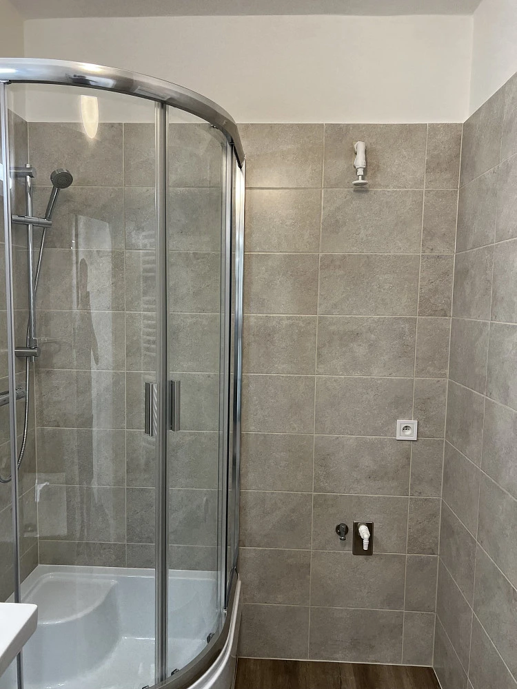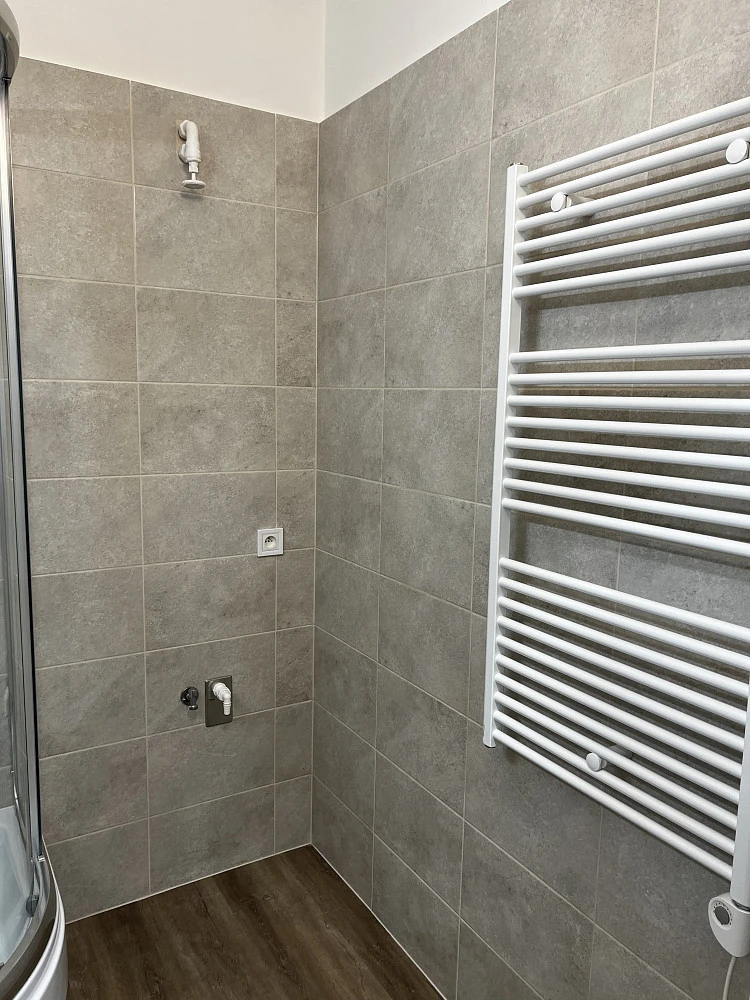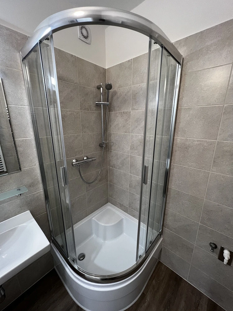 Moderní koupelna se sprchovým koutem s vyvýšenou vaničkou a sezením, kde je možné pohodlně koupat i malé děti, termostatická sprchová baterie na nastavení teploty vody, umyvadlo, zrcadlo s nasvícením, přívod pro pračku, otopný žebřík na sušení ručníků, ventilátor na odvod par. Samostatné WC s automatickým ventilátorem.