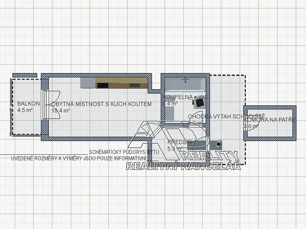 Celková plocha bytu 36,3m2, podlahová plocha [28,3m2] + balkon [4,4m2] + sklep [3,6m2].