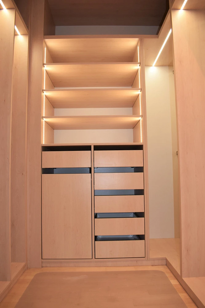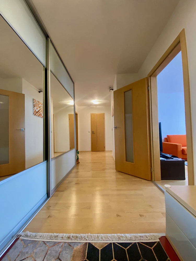 Dominantou tohoto bytu je dostatek úložného prostoru v podobě vestavěných skříní. V jednom z pokojů navíc můžete vstoupit do samostatného, osvětleného šatníku.