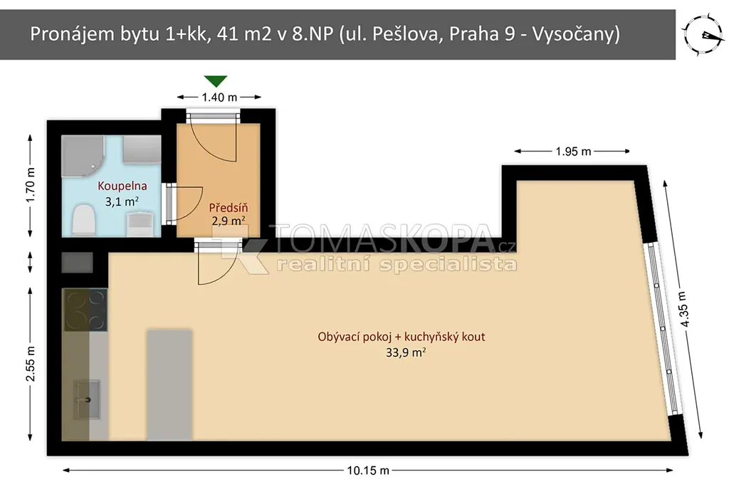 Nabízím k pronájmu světlý byt o dispozici 1+kk a celkové ploše 40,9 m², který se nachází v 8. nadzemním podlaží domu s výtahem v ulici Pešlova v oblíbené části Praha 9 – Vysočany.