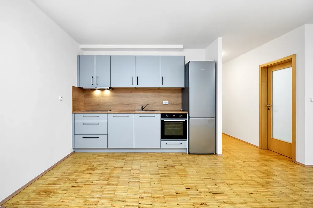 Kuchyňská linka je vybavena vestavnými spotřebiči Siemens, konkrétně myčkou nádobí, elektrickou troubou a varnou deskou. Lednice je samostatně stojící. Byt se nabízí bez dalšího vybavení, což umožňuje novému nájemci zařídit si interiér dle vlastních představ.
