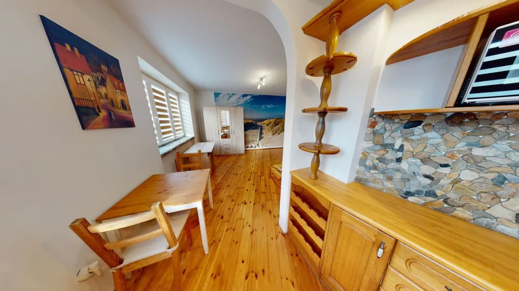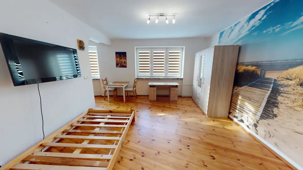 V pokoji se nachází šatní skříň, postel bez matrace, stůl a židle. Na zdi je televize. Zachovalá starší kuchyňská linka disponuje elektrickou troubou, sklokeramickou ploténkou a mikrovlnkou.