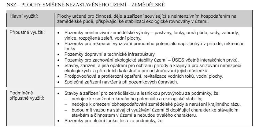 Parcela je v územním plánu vedena jako „Plochy smíšené nezastavěného území“, kde je dle územního plánu možné využití na zahradu, pastvinu, sady a louky. Je tedy vhodné na různé odpočinkové aktivity i pro milovníky koní nebo drobné chovatele na pastvinu. Díky odlehlému místu je zde naprostý klid.