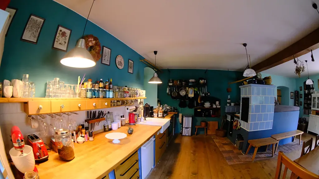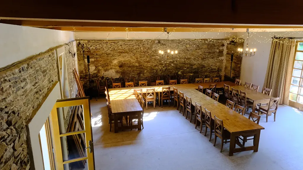 - kapacita cca 80 lidí, WC, sprcha, dřevěné schody do patra, dřev.patro - zázemí např. pro kapelu, posezení, topení - plyn.mob.topidla, ozvučení prostor, příprava pro krb (v těchto prostorech se konají netradiční svatby, oslavy a workshopy)