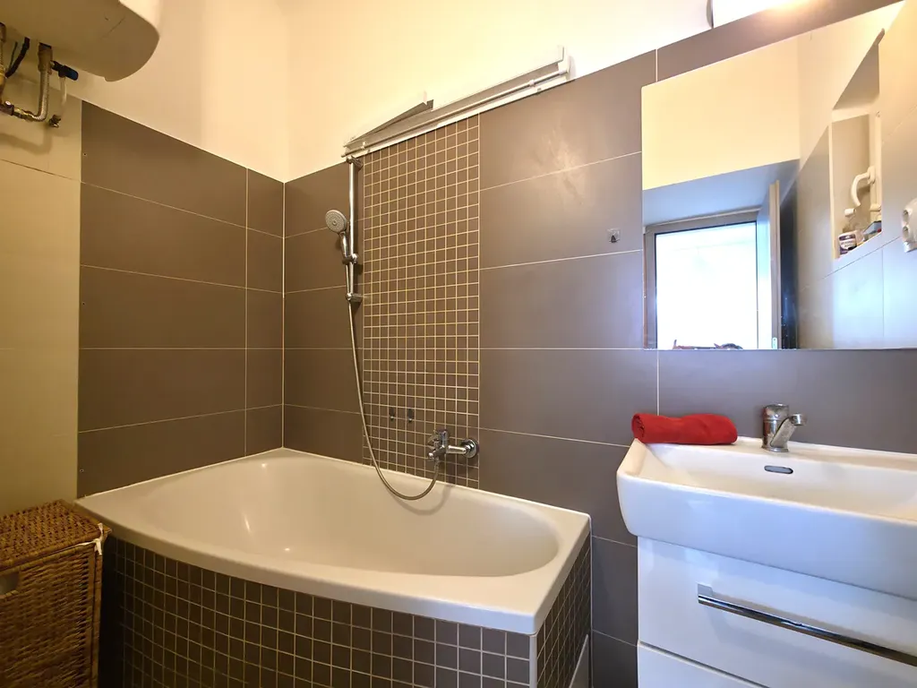 Dispozice bytu zahrnuje samostatnou toaletu s umyvadlem a koupelnu s vanou, umyvadlem se skříňkou, zrcadlem a otopným žebříkem.