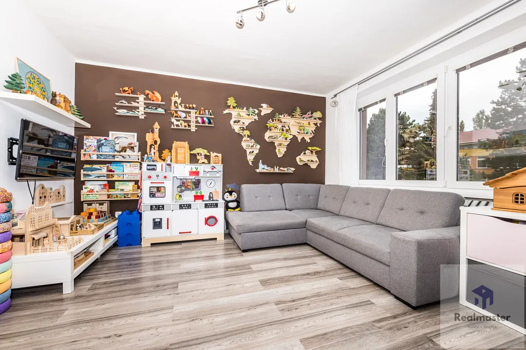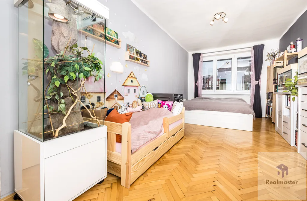 Byt nabízí i dostatek úložných prostor, v chodbě bytu nalezneme vestavnou skříň. Dětské pokoje, které poskytnou vašim dětem komfortní zázemí. Byt se nabízí bez nábytku na fotografiích.