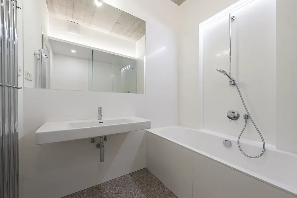 Tento přístup vychází ze spolupráce architekta Jiřího Huška se švýcarským architektem Christianem Kerezem. Beton zde zároveň odkazuje na broušené teracové podlahy i opěrnou stěnu dvora, s nimiž tvoří jednotný, harmonický celek oslavující pravdivost a poctivost konstrukce. Součástí bytu je také samostatná garsoniéra s koupelnou (29 m²), ideální pro hosty, au-pair či domácí kancelář. Je orientována do tichého vnitrobloku a poskytuje naprosté soukromí s výhledem do stromořadí a popínavé zeleně. Je to malý svět sám pro sebe – prostor, který přirozeně doplňuje charakter celého bytu.