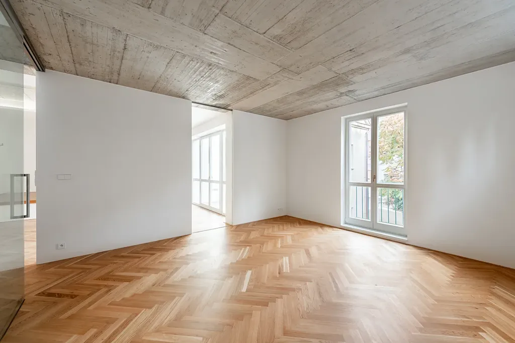 Byt se nachází ve 2. nadzemním podlaží a tento prostor má zcela jedinečnou atmosféru – její podstatu určuje beton, vnímaný zde jako ušlechtilý materiál a geniální vynález litého umělého kamene. Celý proces jeho zpracování byl ponechán v maximální autenticitě. Záměrně bylo použito již jednou využité dřevěné bednění, které nese stopy práce řemeslníků a vytváří přirozeně živou, neuhlazenou strukturu. Výsledný povrch působí naturálně a opravdově, podobně jako při rekonstrukcích, kdy se na světlo znovu dostávají skrytá tajemství minulosti.