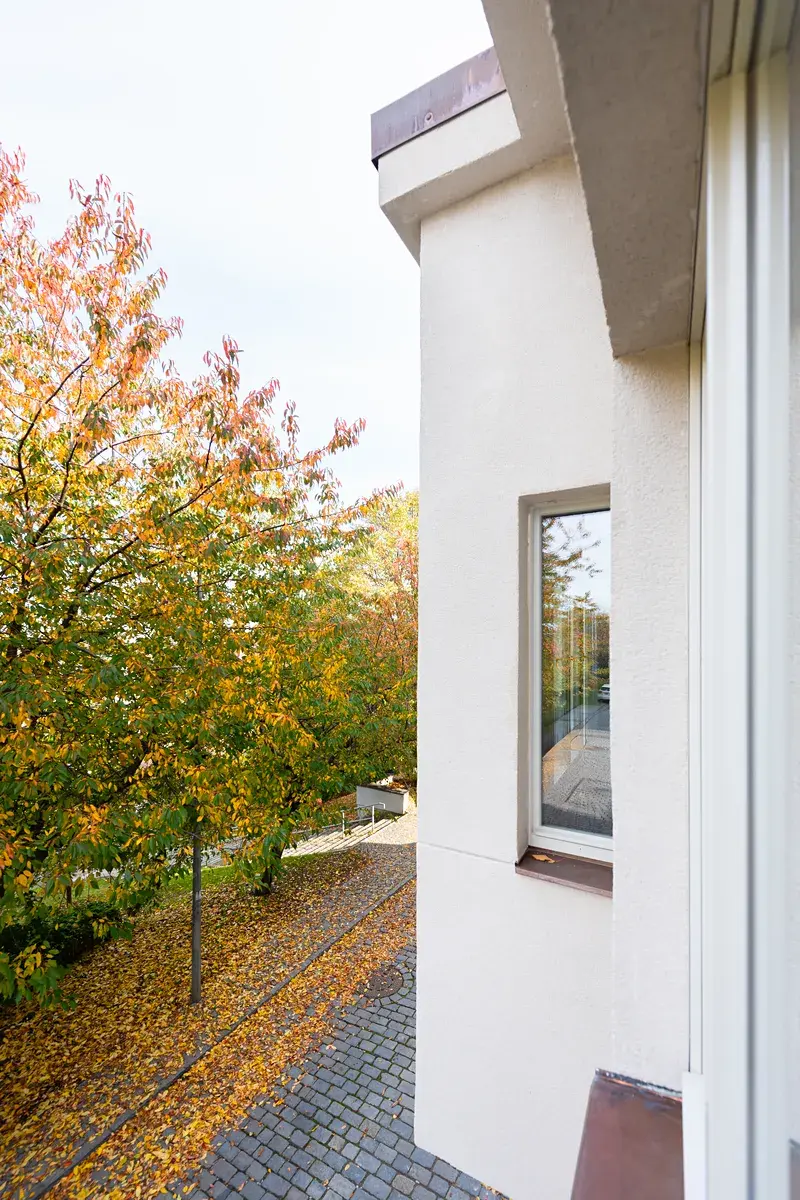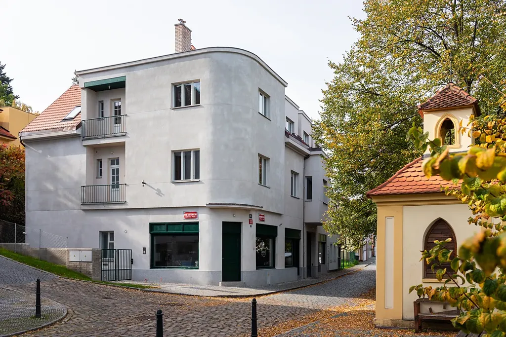 Viladům, jehož dominantou je zaoblené nároží, prošel kompletní rekonstrukcí a byl citlivě rozšířen přístavbou.