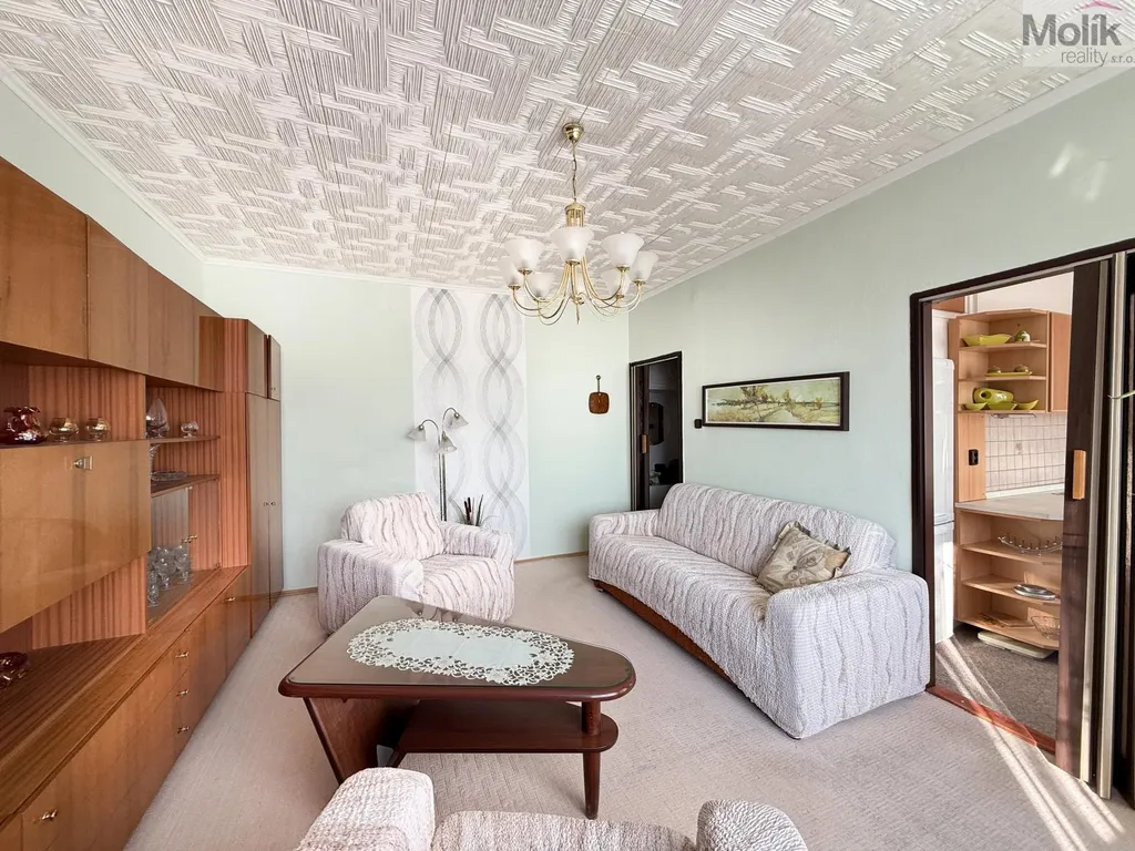 Byt je v pěkném udržovaném stavu - kuchyňská linka se sporákem, koupelna obložená keramickým obkladem s vanou, zařízeno nábytkem, který v bytě zůstává k užívání.
