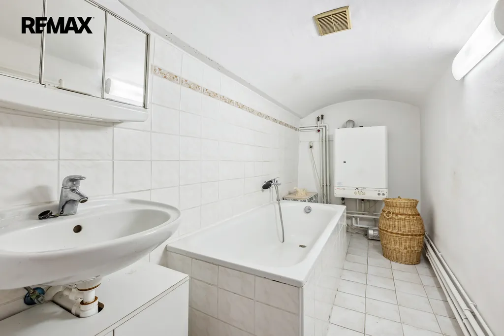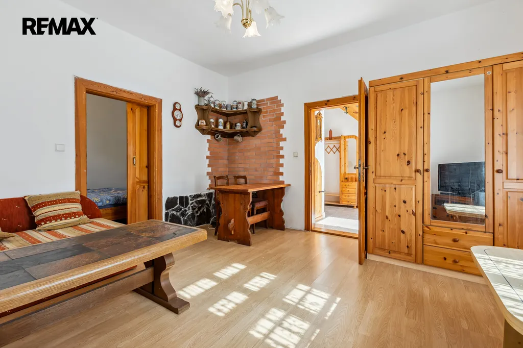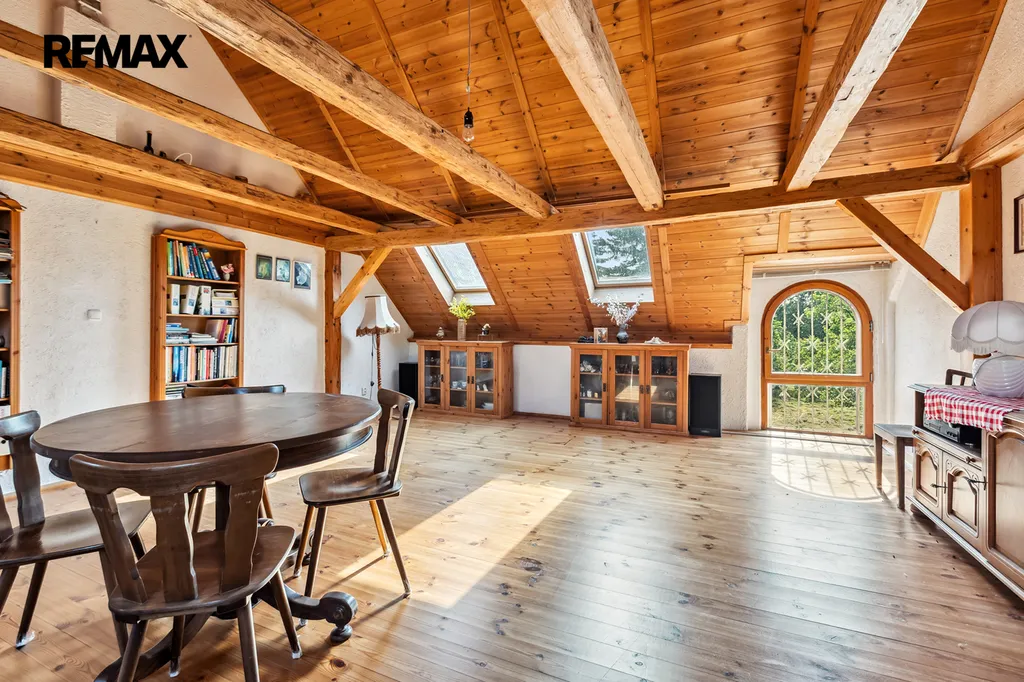 Na stodolu navazuje rodinný dům. V prvním patře se nachází dvě útulné ložnice, kuchyň, koupelna a místnost o ploše 38 m², která se perfektně hodí jako rodinná jídelna, ateliér, herna nebo třeba prostor pro podnikání. V horním patře najdete další ložnici, světlý obývací pokoj a druhou koupelnu. Dům je vytápěn plynovým kotlem, kotlem na tuhá paliva a krbem, který dodává interiéru příjemnou atmosféru.