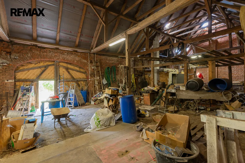 Hospodářská budova – samostatně stojící patrová stodola 178 m² - možnost přestavby na stylovou restauraci, svatební sál, ubytování nebo víceúčelovou rekreační část. Díky přiložené vizualizaci si můžete představit, jak by se dala stodola zařídit a jak by mohla vypadat. Pod stodolou se nachází prostorný sklep – ideální pro uskladnění produktů z vlastní zahrady, vína nebo kulinářských zásob. Stodola díky své velikosti, dispozici a atmosféře nabízí výjimečný potenciál pro svatby, oslavy, workshopy nebo gastronomický provoz. Přilehlá garáž/dílna.