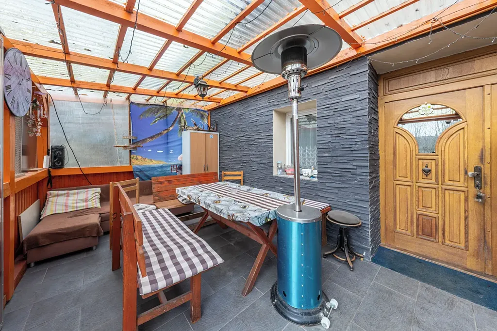 Dům nabízí v přízemí dispozici 4+kk o výměře cca 110 m² – tedy tři samostatné pokoje a obývací prostor propojený s kuchyní, který tvoří přirozené centrum domova. Součástí je také zakrytá veranda s posezením, navazující na zahradu a poskytující příjemné místo pro odpočinek.