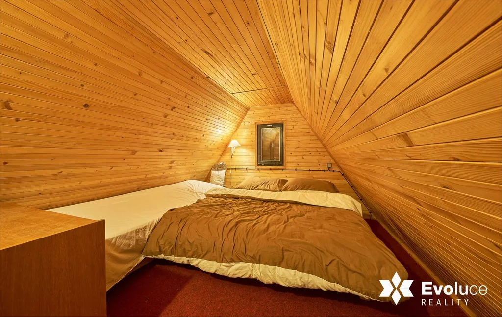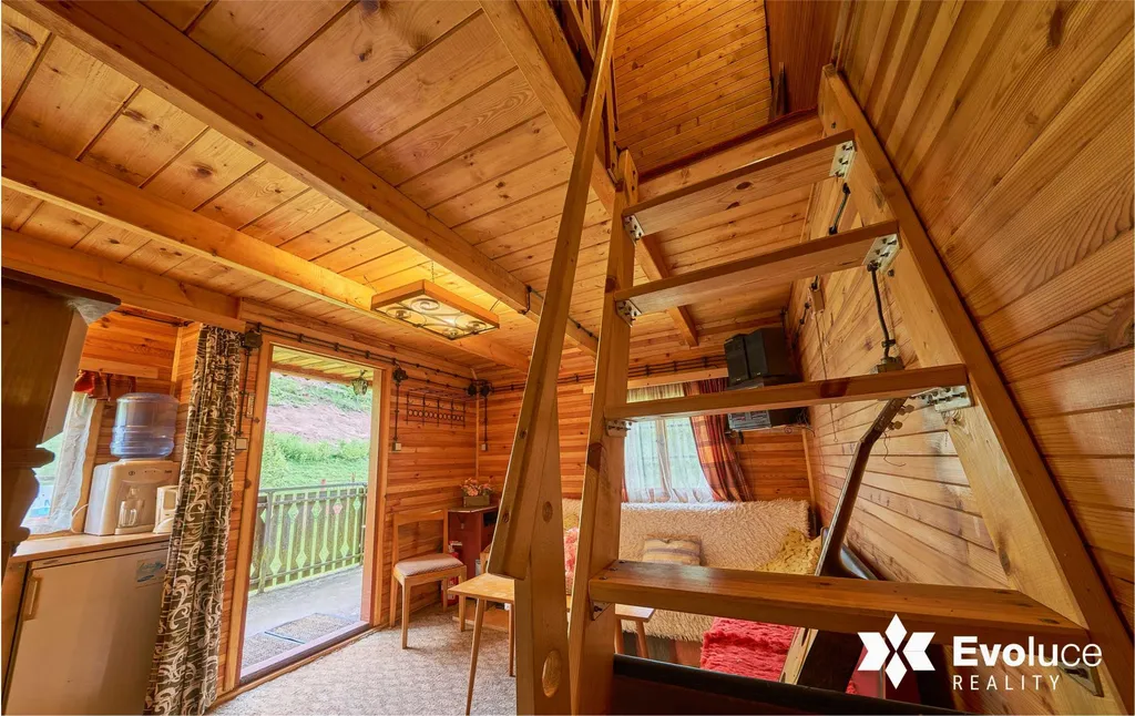 Dispozice: obytná místnost s kuchyňkou, lednicí, ložnice v podkroví, kam vcházíte po dřevěných schodech. Stav chaty velmi dobrý. Topení akumulačními kamny.