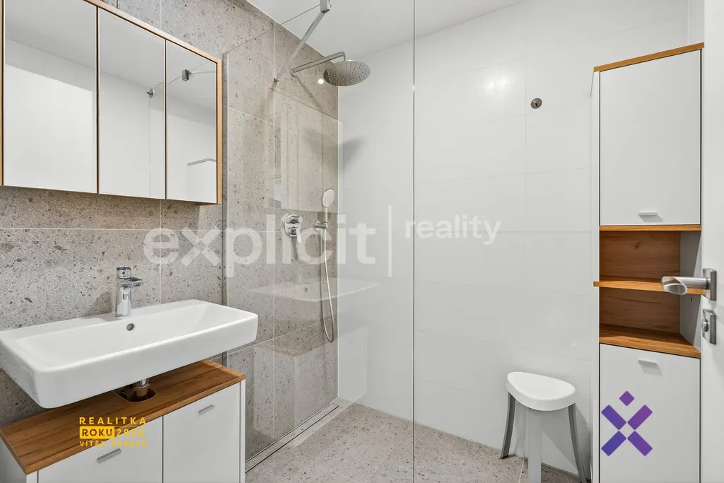 Koupelna se sprchovým koutem a elektrickým žebříkem, samostatné WC, okna v hliníku, venkovní elektrické žaluzie na všech oknech, sítě proti hmyzu, bezpečnostní dveře, vysoké interiérové dveře výšky 220 cm a šatna přímo vedle ložnice s přípojkou na pračku a sušičku i dostatkem místa pro skříně je, velkým zázemím tohoto bytu.