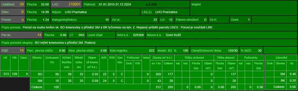 - p.č. 128 vedená jako lesní pozemek o celkové výměře 11 299 m2, vlastníme podíl 2/12 tedy 1 884 m2 (stáří lesa 111 let - zastoupení dřevin borovice, smrk, stáří lesa 57let - zastoupení dřevin bříza, smrk a stáří lesa 43let - zastoupení dřevin smrk)