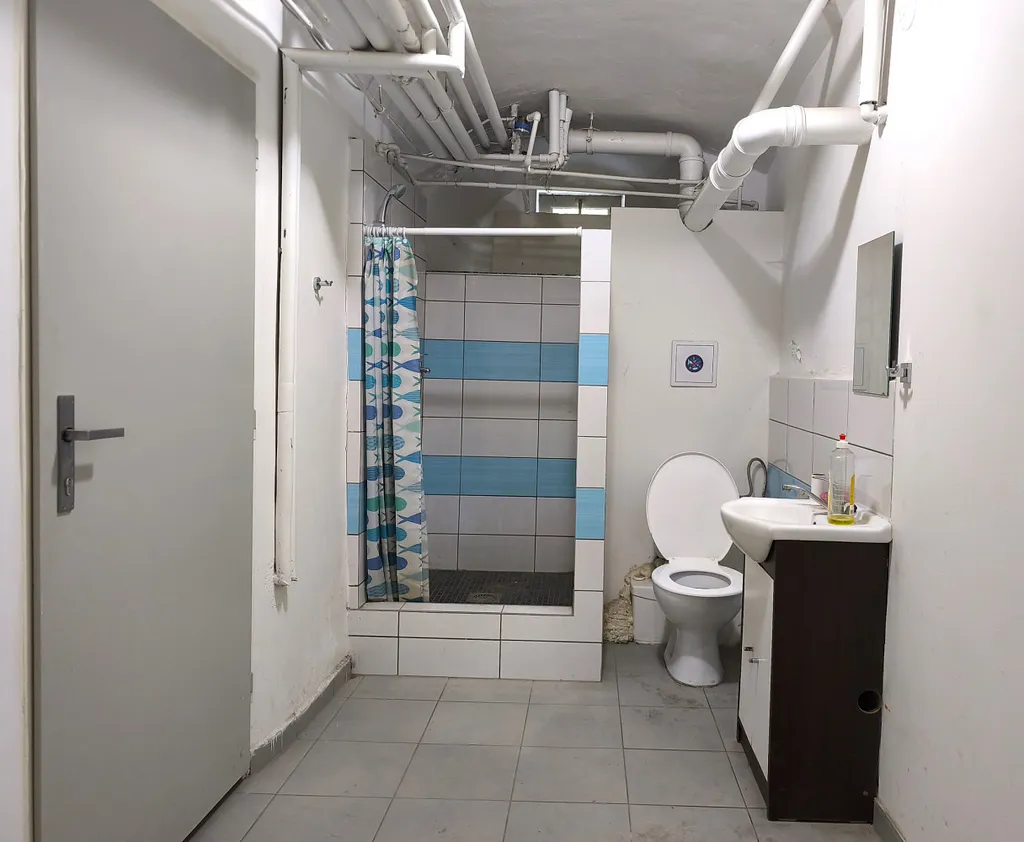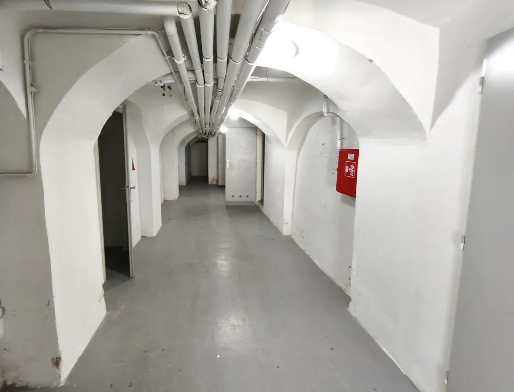 Součástí je koupelna se sprchou s možností zapojit pračku (6m²), šatna (9m²), chodba (34 m²), a dva prostory pro skladování (65 m² a 23 m²).