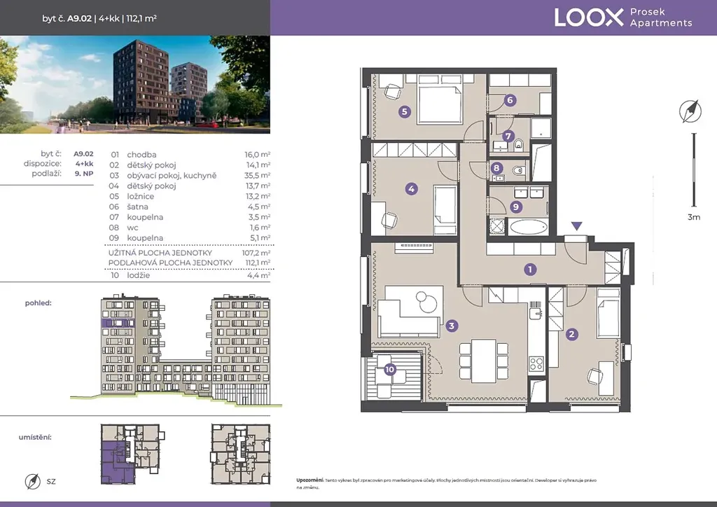Nabízíme k pronájmu kompletně vybavený byt o dispozici 4+KK s výměrou 112 m2 a lodžii 4,4 m2 v 9.NP v 11patrovém bytovém domě LOOX přímo u metra Prosek.
