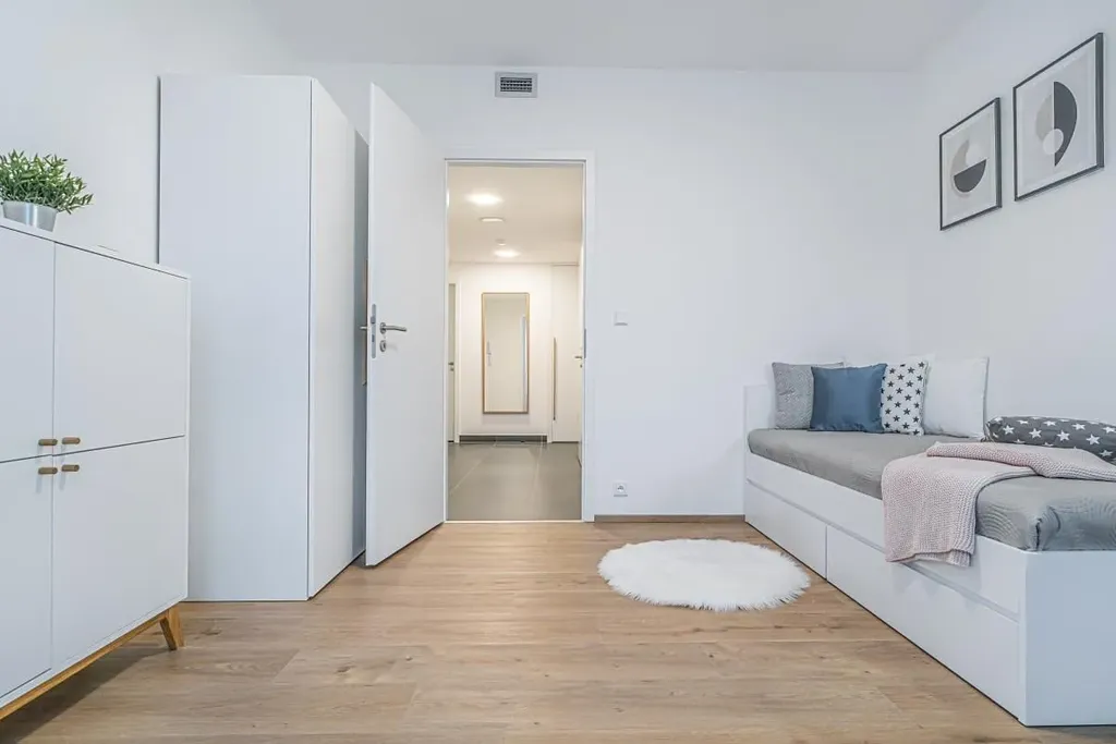 U vstupu do bytu se nachází předsíň s botníkem, šatní skříní s věšáky. Byt je vybaven vestavěnými skříněmi, kuchyňskou linkou s vestavěnými spotřebiči, jídelním stolem, židlemi, sedačkou, konferenčním stolem, komodou a SMART televizí. V ložnici se nachází dvoulůžková postel s matracemi, noční stolky a vestavěná skříň. V koupelně se nachází sprchový kout. V technické místnosti je zabudována pračka se sušičkou.