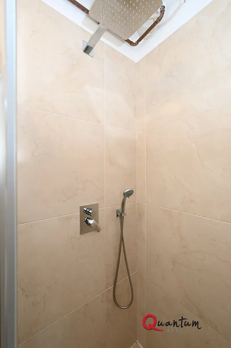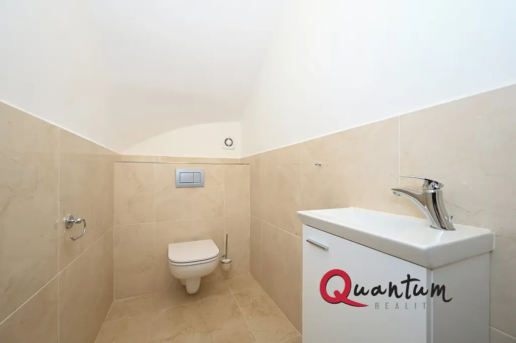 Ze zádveří je přístupná kuchyně 14,8 m2 s novou kuchyňskou linkou vybavenou sklokeramickou varnou deskou, horkovzdušnou troubou, digestoří a pračkou, lednice je samostatně. Na podlaze je praktická dlažba. Z kuchyně se vstupuje do pokoje 15,6 m2 s krásným výhledem do zahrady a do údolí, na podlaze jsou modřínová prkna. Koupelna, se sprchovým koutem, topným žebříkem a bílým koupelnovým nábytkem, je prosvětlena oknem. Toaleta s umývátkem je samostatná.