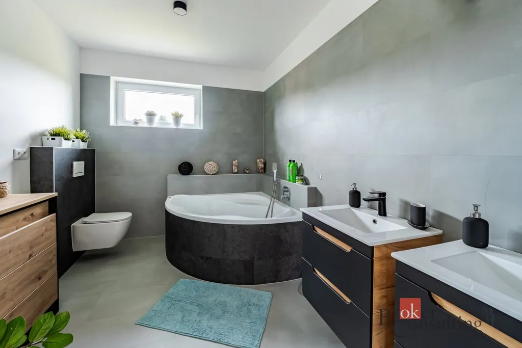 V koupelnách je potřeba doplnit některé prvky, například topné žebříky, zrcadla a umyvadlo v menší koupelně. V interiéru jsou částečně instalovány obložky dveří, zbývající části je možné dokončit dle vlastního výběru budoucího majitele.