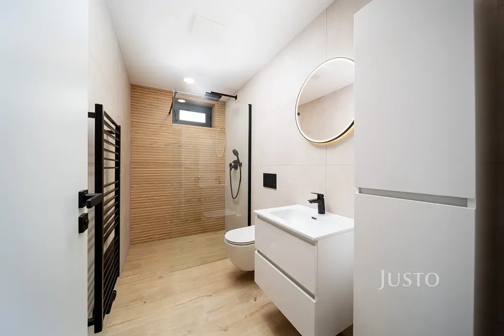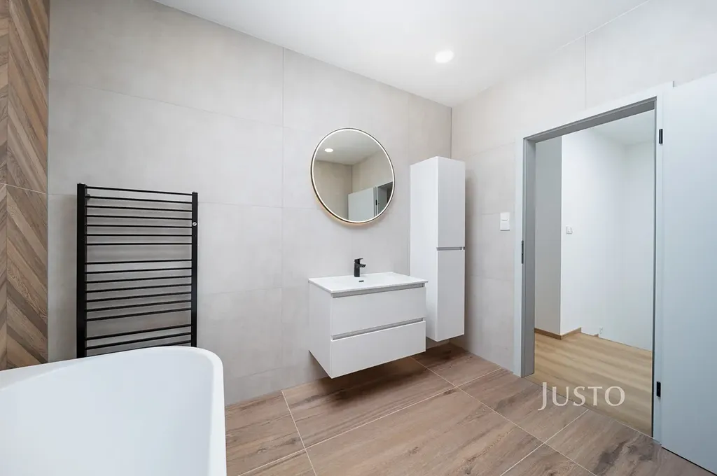 V podkroví najdete prostornou ložnici (17 m²) s vlastní šatnou a dva dětské pokoje (15 m² a 14 m²). Komfort doplňuje druhá koupelna s vanou a toaletou (7 m²). Z chodby je přístup do půdního prostoru, který poskytuje praktické úložné místo.