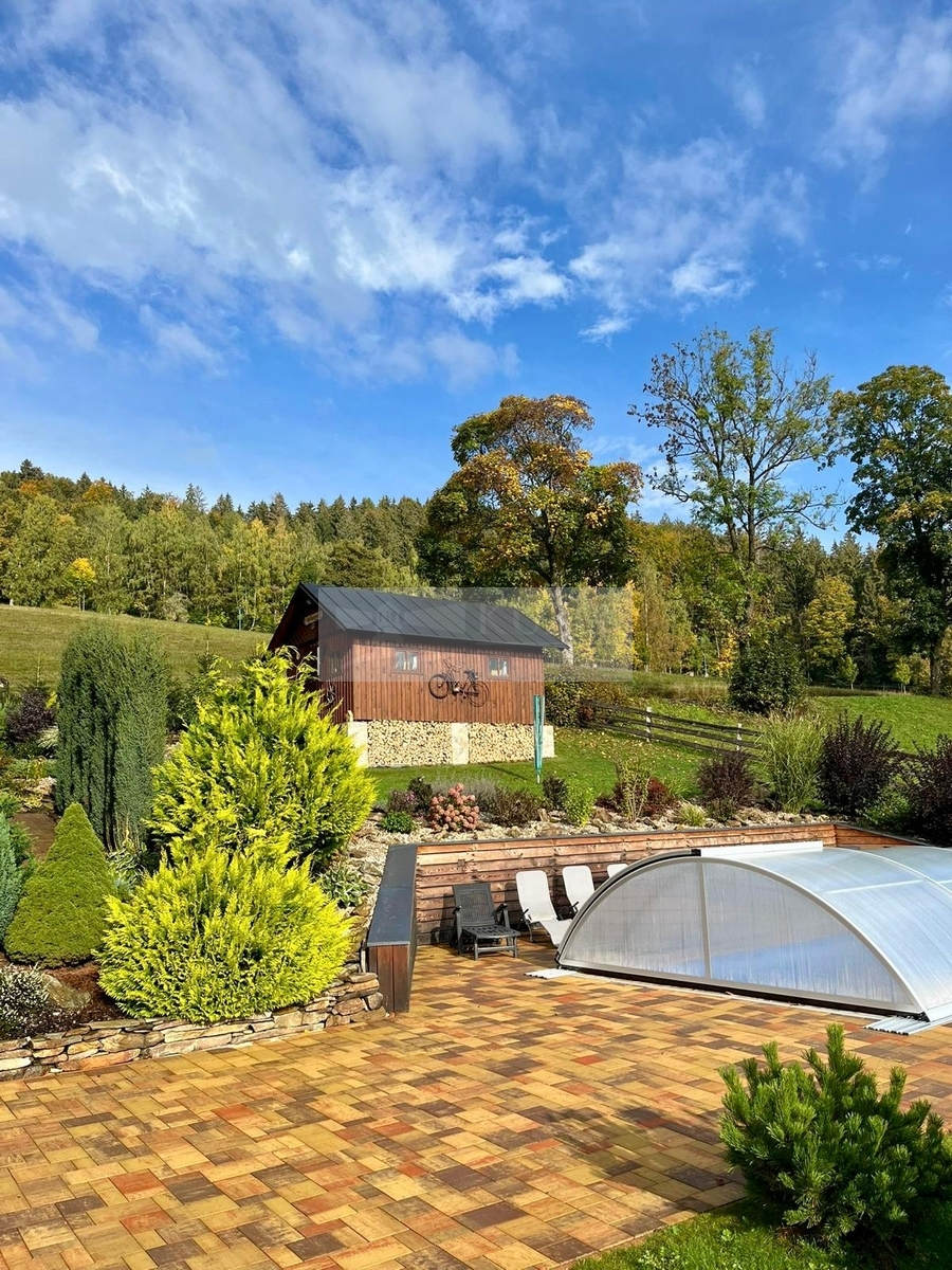 K domu náleží pozemek o celkové výměře 1 850 m², který poskytuje dostatek prostoru pro relaxaci hostů i případný další rozvoj areálu. Velkou výhodou je vlastní studna a napojení na obecní kanalizaci, což přispívá k bezproblémovému a ekonomickému provozu.