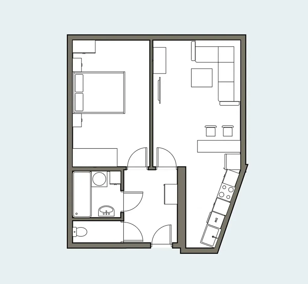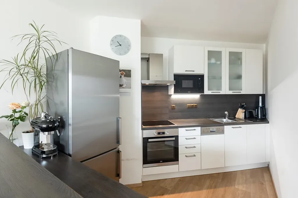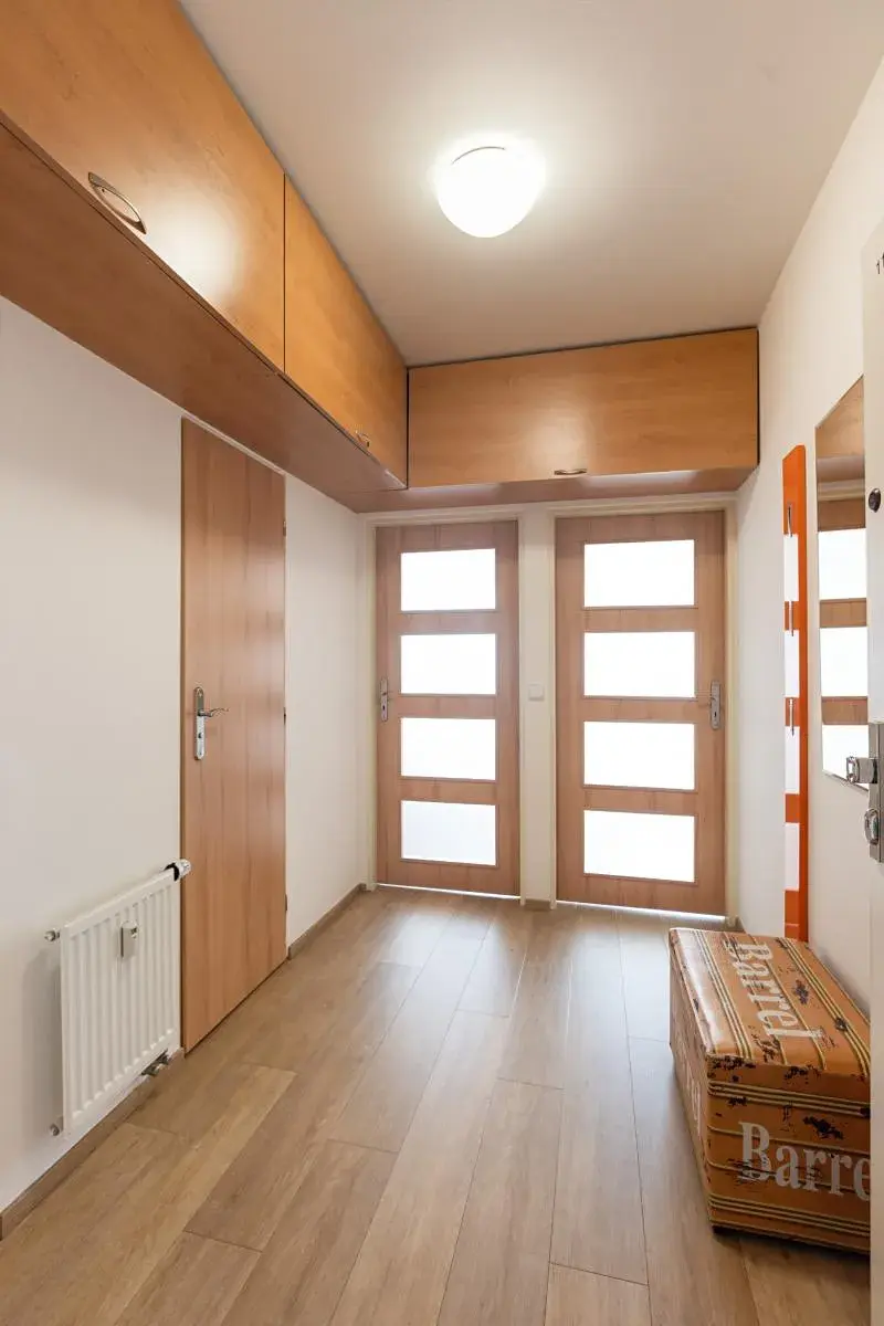 Byt je kompletně vybavený a připravený k okamžitému nastěhování. Dispozice zahrnuje obývací pokoj s kuchyňským koutem, samostatnou ložnici se dvěma prostornými šatními skříněmi, koupelnu včetně pračky, samostatnou toaletu a předsíň s úložnými prostory. Součástí bytu je také balkon, který nabízí příjemné místo k odpočinku. Kuchyňská linka je vybavena všemi potřebnými spotřebiči.