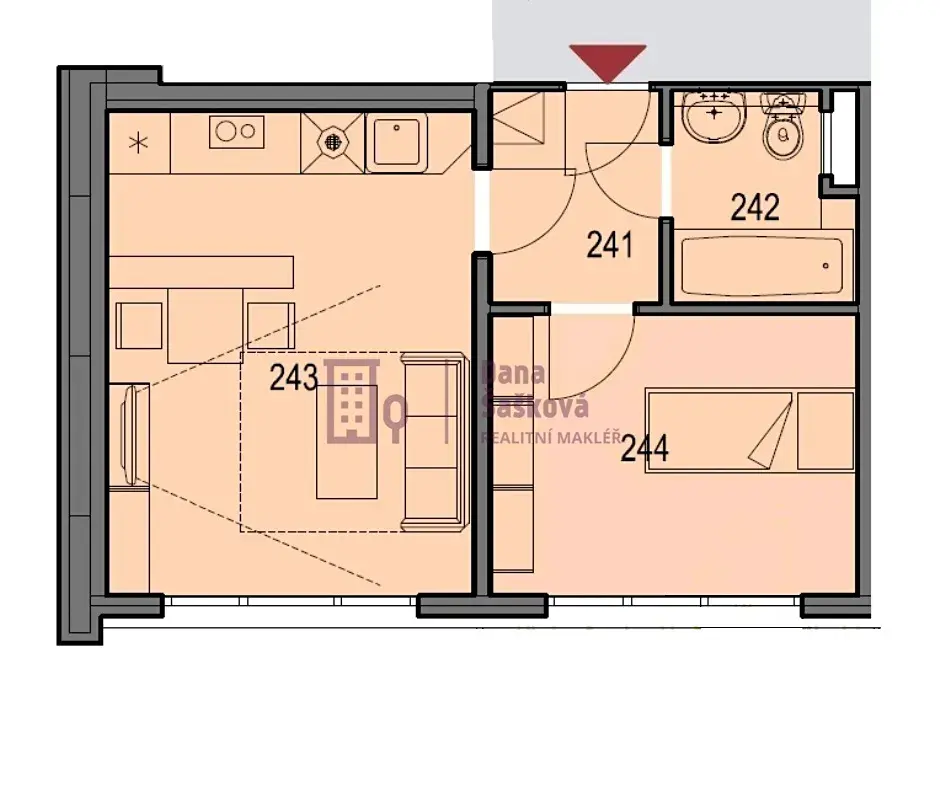 Celkovou plochu 31 m2 tvoří vstupní chodba, koupelna s vanou a toaletou, obývací pokoj s kuchyňským koutem a ložnice.