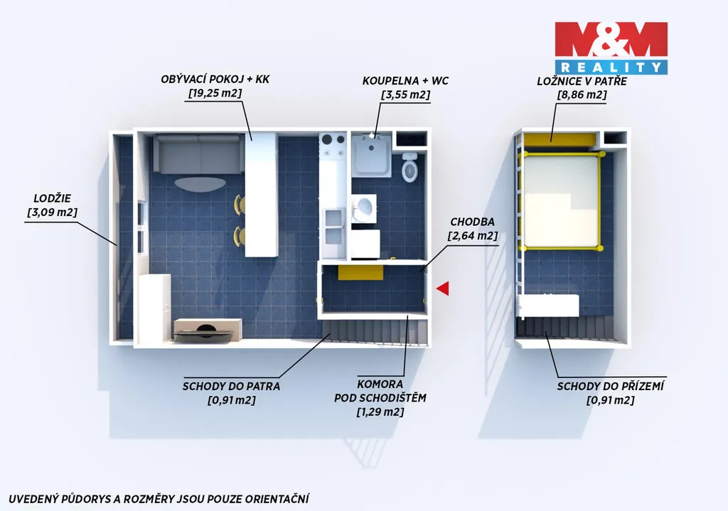 Rozdělení na denní a noční zónu dává bytu vzdušnost a pocit mnohem většího prostoru než u běžných garsonek.
