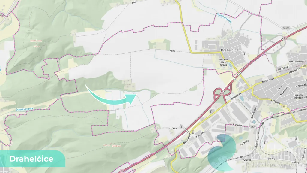 Pozemek se nachází v klidné části zemědělské krajiny na okraji obce Drahelčice, s přístupem po polní cestě a je v blízkosti zástavby.