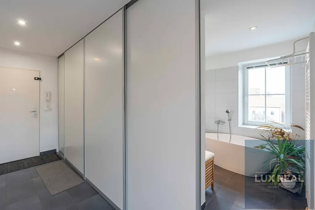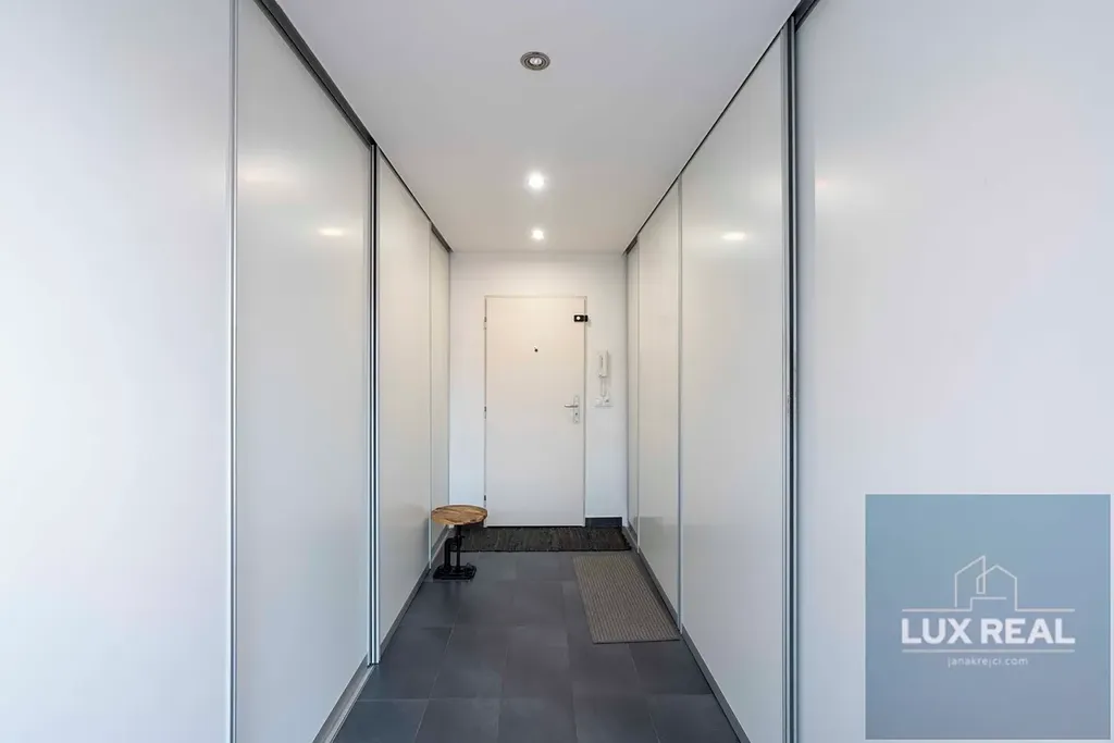 Vstupní chodba s vestavěnými skříněmi, které zároveň slouží i jako dveře oddělující chodbu od koupelny (sprchový kout, samostatně stojící vana, a oddělená toaleta), ale i od obytného otevřeného prostoru. Z této vstupní chodby se dostane také přímo na terasu.