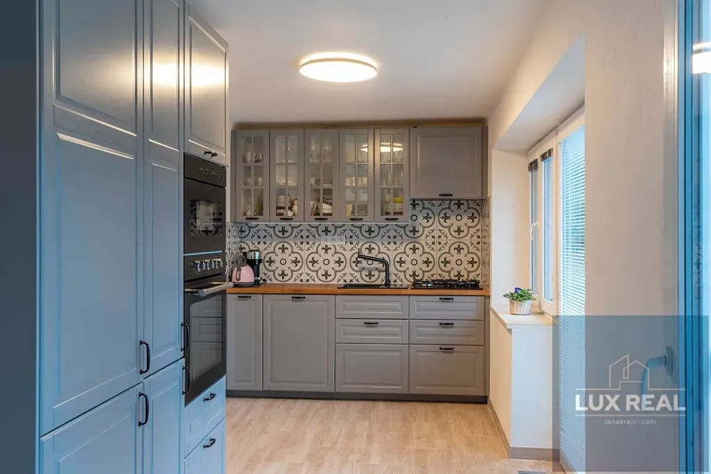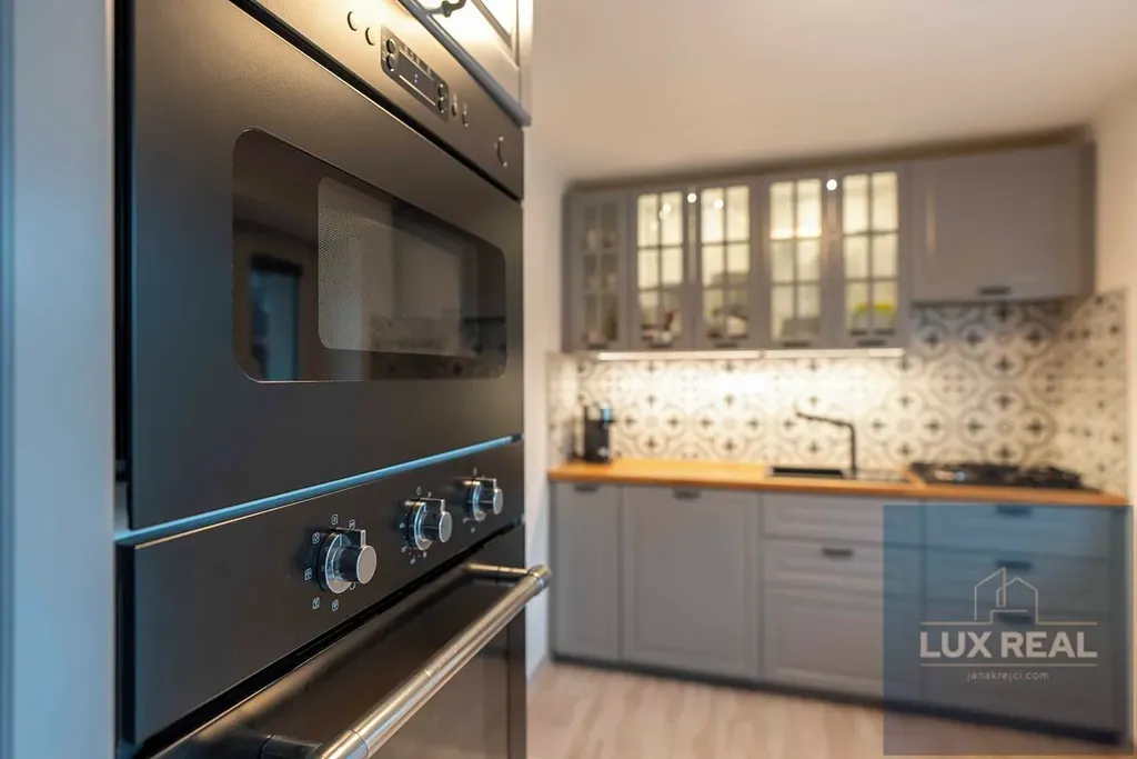 Kuchyně je komplet vybavena vestavěnými spotřebiči (myčka, mikrovlná trouba, elektrická trouba, lednice s mrazícím boxem).