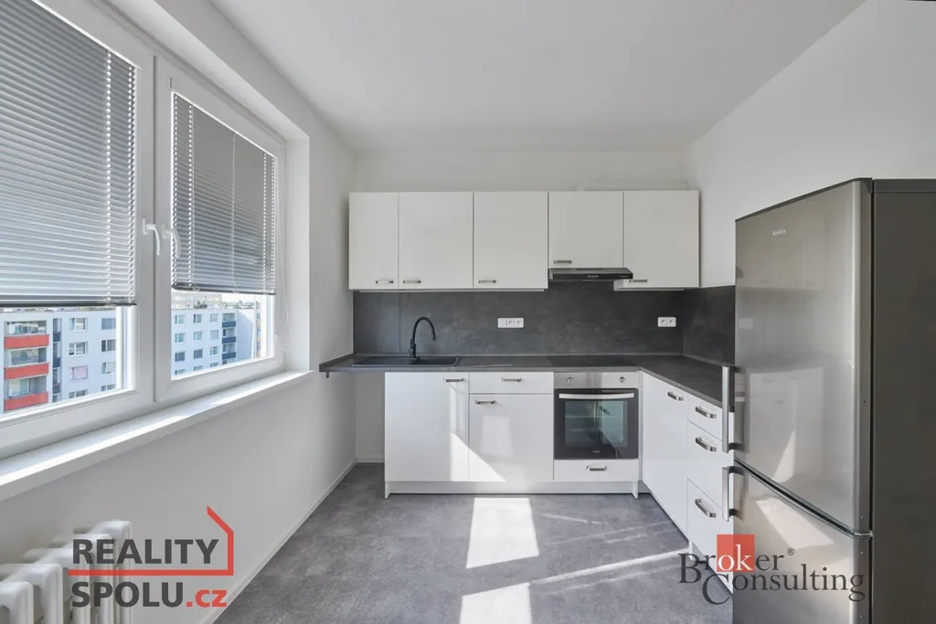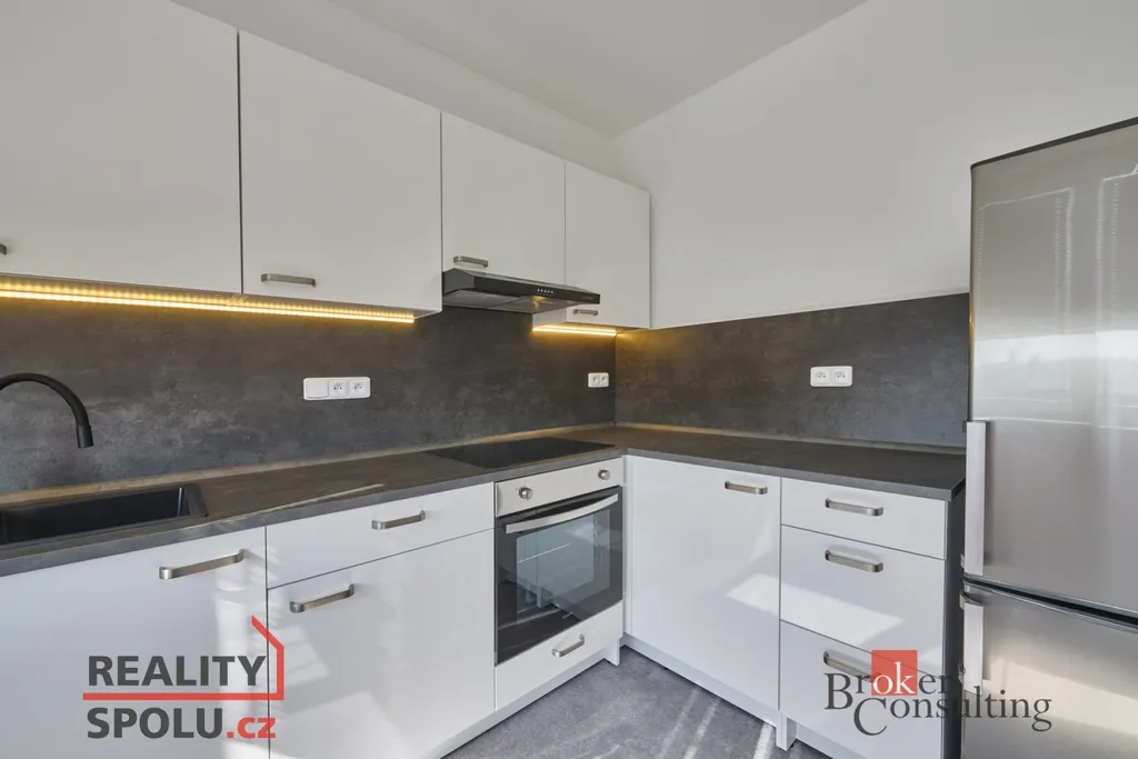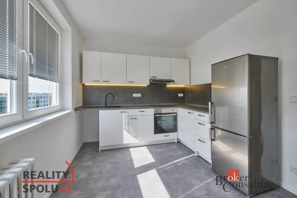 Pokud jde o vnitřní vybavení, tak se byt pronájímá s novou a vybavenou kuchyňskou linkou, včetně lednice, pračky a nábytku (viz fotografie).