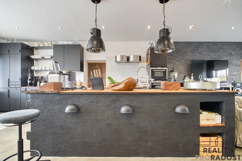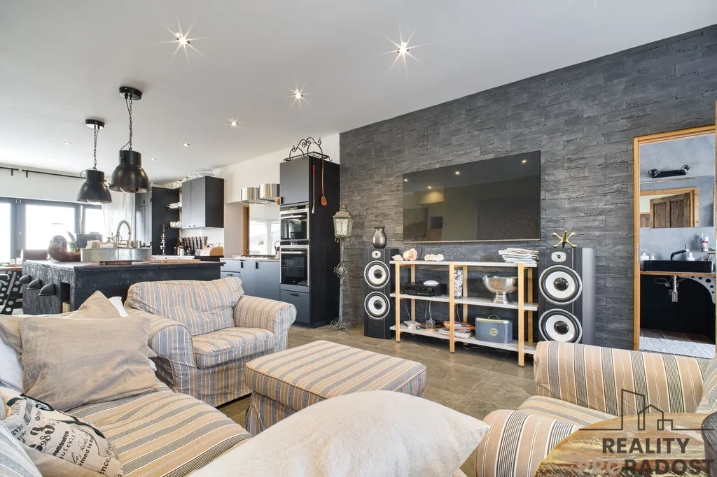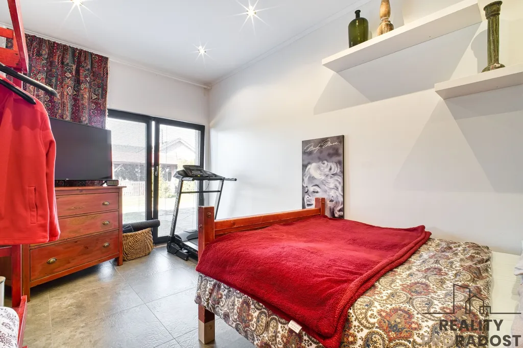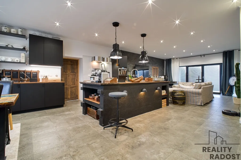 Dominantou přízemí je světlý a vzdušný obývací pokoj propojený s otevřenou, plně vybavenou kuchyní a jídelní částí. Dále zde naleznete pokoj pro hosty, technickou místnost, koupelnu s walk-in sprchou a vstupní halu. Z obývacího pokoje, koupelny i pokoje pro hosty je přímý vstup do zahrady přes francouzská okna, přičemž všechny tyto místnosti jsou orientovány na jih, což zajišťuje dostatek denního světla po celý den.