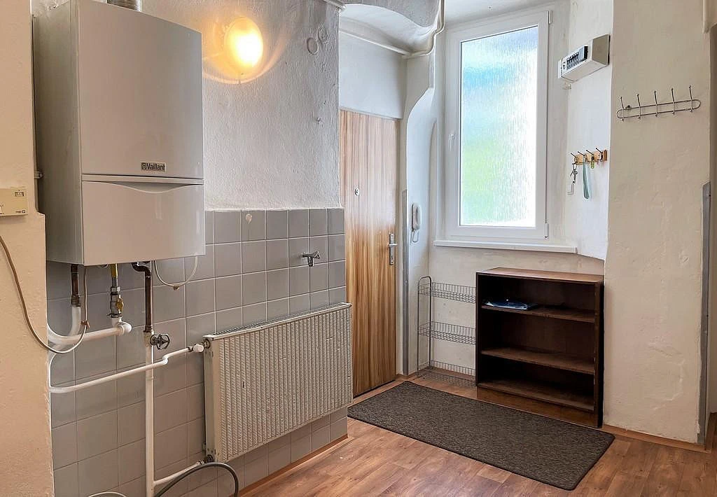 Za vstupními dveřmi se nachází prostorná chodba o výměře cca 12 m and sup2;, která je vybavena menší částečně prosklenou skříní. Součástí chodby je také plynový kotel, jenž zajišťuje vytápění celého bytu.