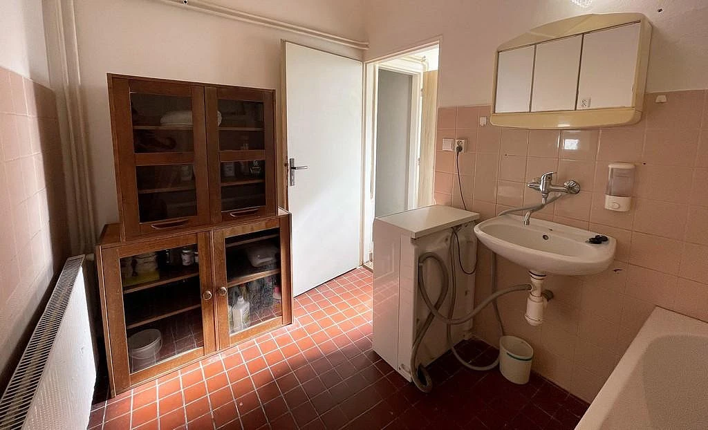 Z kuchyně se dále vstupuje na menší chodbu (cca 1,2 m and sup2;), ze které je přístup na samostatnou toaletu (cca 1,2 m and sup2;) a do koupelny o velikosti cca 5,5 m and sup2;. V koupelně se nachází vana, umyvadlo, zrcadlová skříňka, koupelnová skříňka, pračka a bojler pro ohřev vody.
