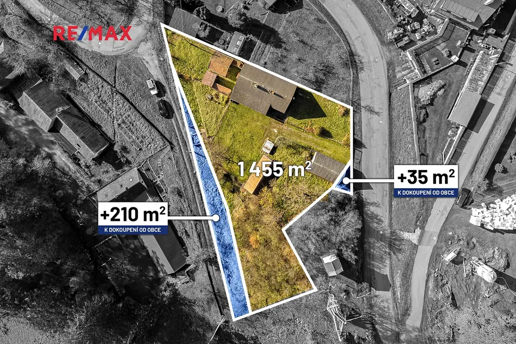 Nemovitost stojí na prostorném, jižně orientovaném pozemku o celkové výměře 1 455 m² a kromě samotné chalupy k ní náleží také soubor vedlejších staveb – zděné i dřevěné kůlny a zděné garáže, které poskytují dostatek prostoru pro dílnu, skladování i parkování.