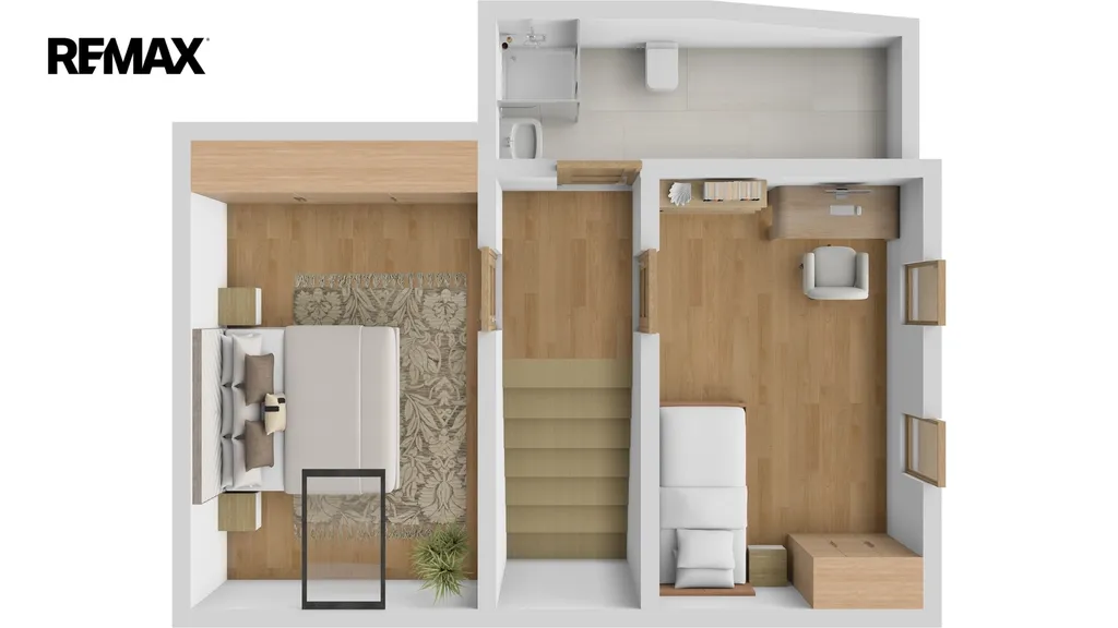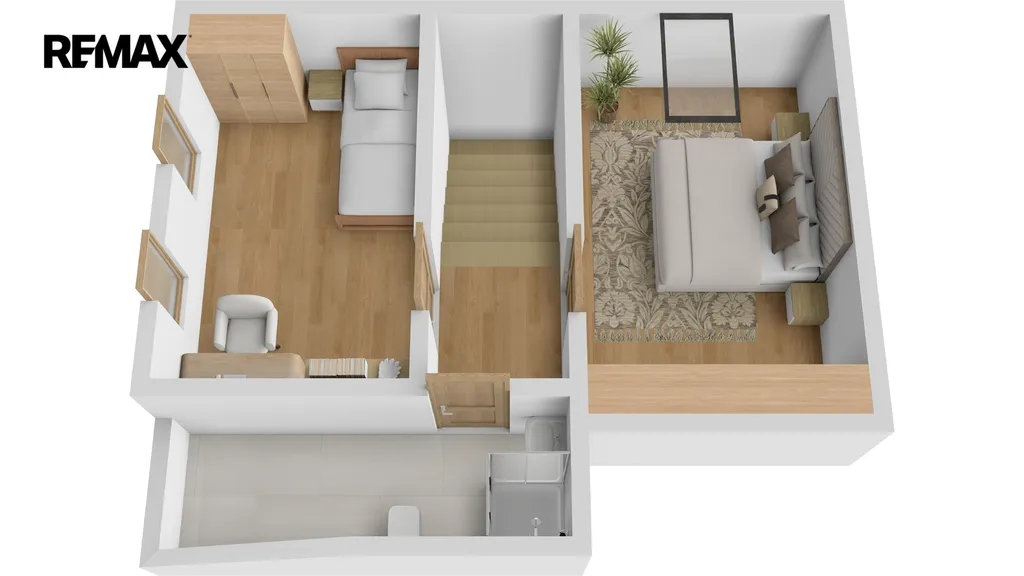 Po otevřeném schodišti se dostaneme do obytného podkroví, kde se nachází: dva samostatné pokoje, koupelna se sprchovým koutem a WC.