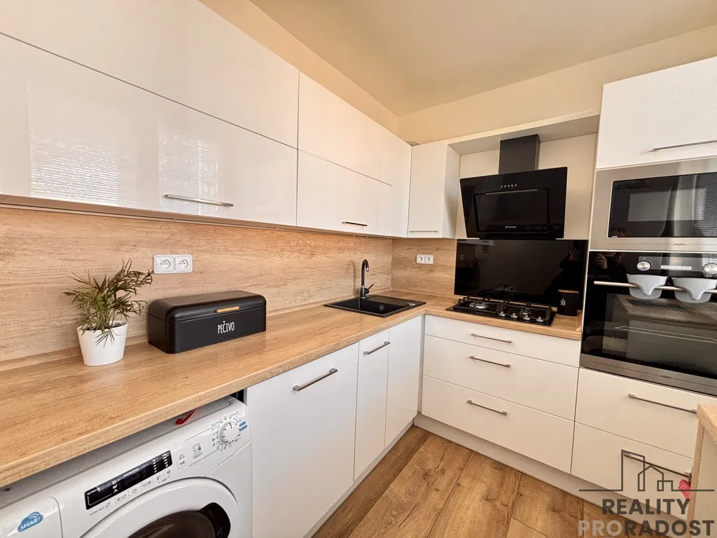Na levé straně bytu se nachází prostorná ložnice (13,10 m²) a kuchyně s moderní kuchyňskou linkou a vestavěnými elektrospotřebiči, která poskytuje také příjemné posezení u okna.