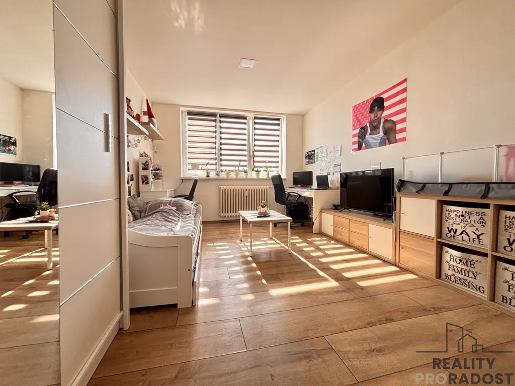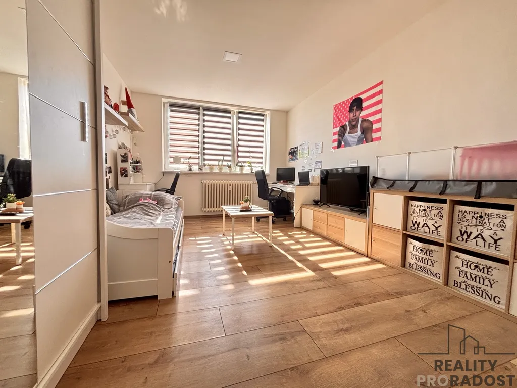 Po pravé straně se nachází světlý obývací pokoj o výměře 18,70 m² se vstupem na balkon orientovaný na východ, který je opatřen mléčným sklem pro větší soukromí. Balkon nabízí ideální prostor pro odpočinek a relaxaci. Vedle obývacího pokoje se nachází prostorný dětský pokoj o výměře 18,90 m². Byt dále nabízí praktickou místnost pro uskladnění sezónních věcí.