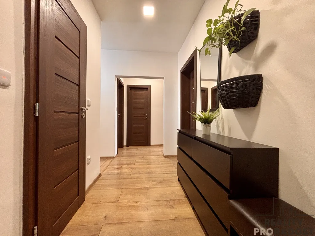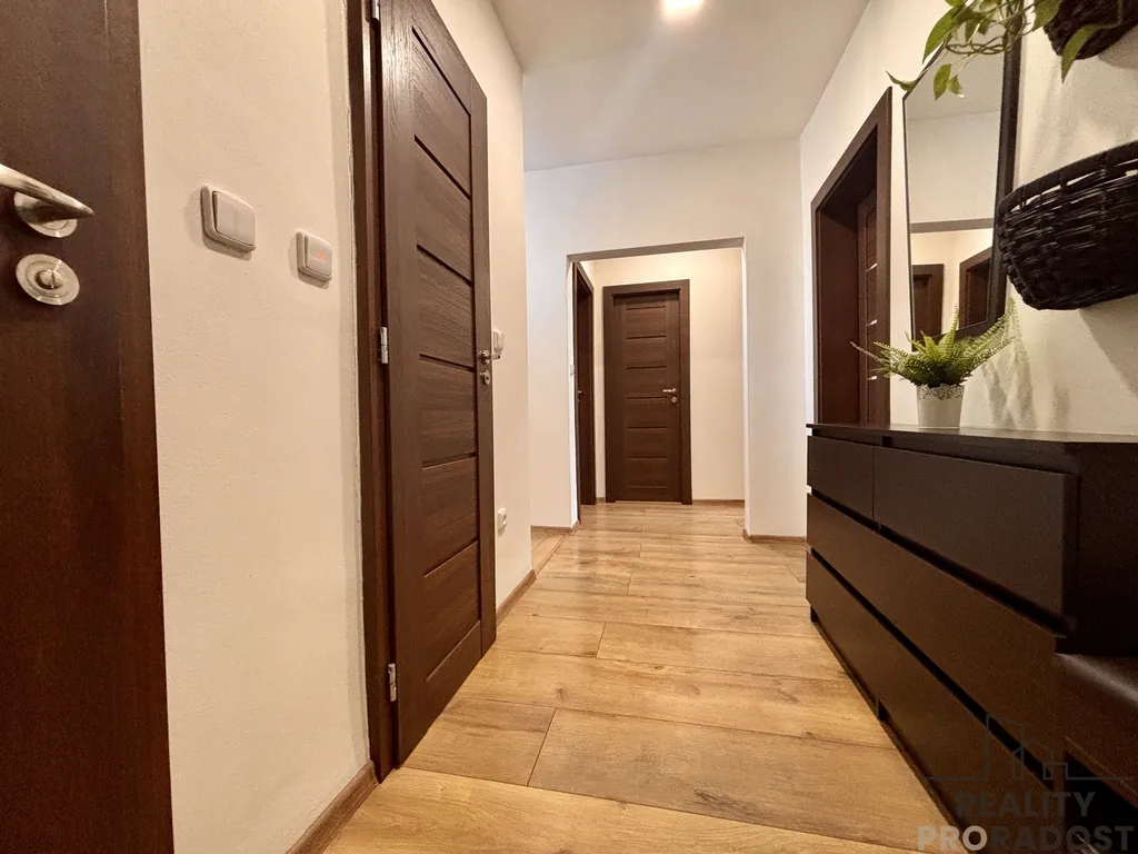 Byt prošel zdařilou a nadčasovou rekonstrukcí a nabízí velmi příjemné a praktické dispoziční řešení. Dominantou bytu je prostorná vstupní chodba, ze které se vstupuje do jednotlivých místností.