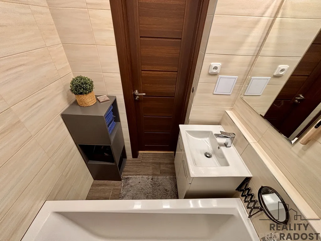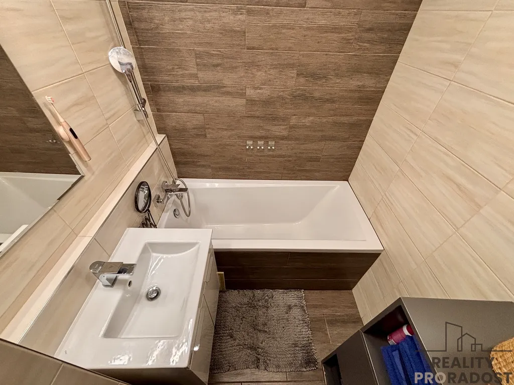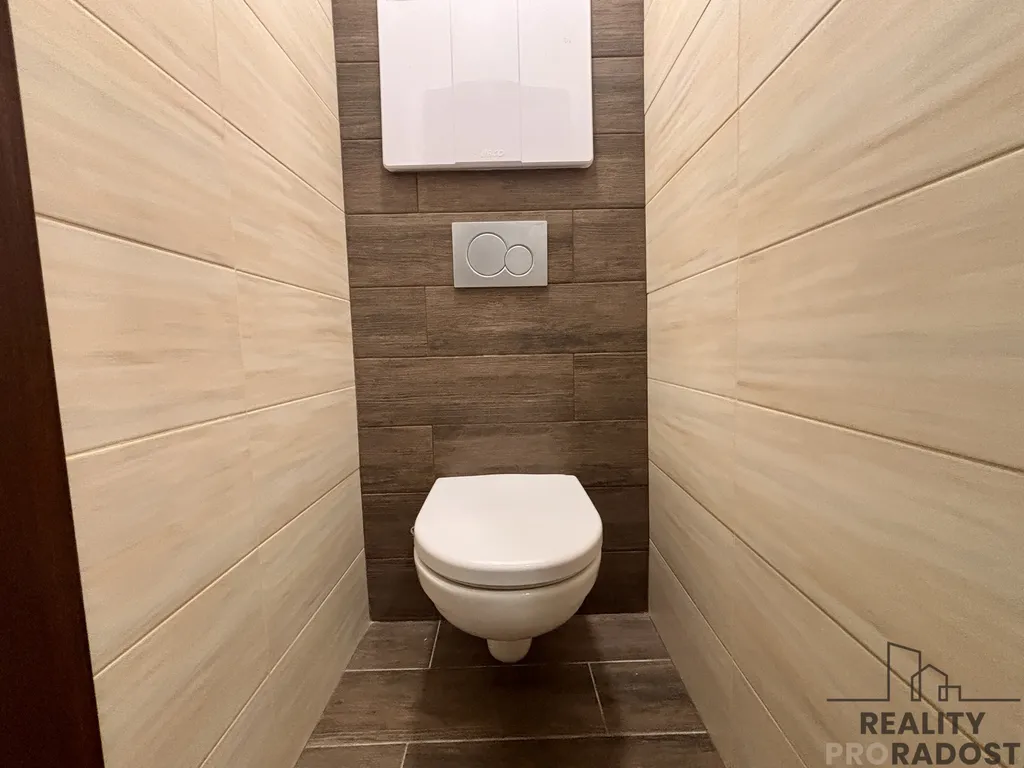 Součástí bytu je také samostatná toaleta se závěsným WC a koupelna s vanou.
