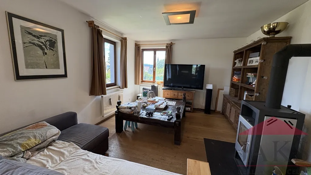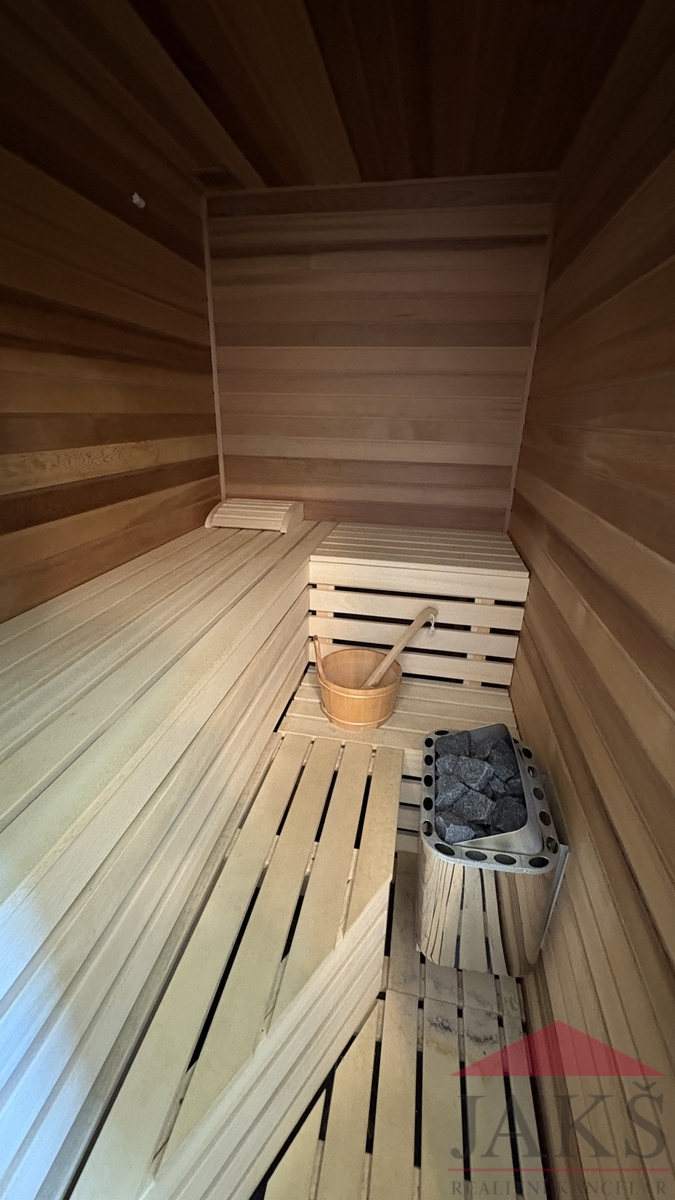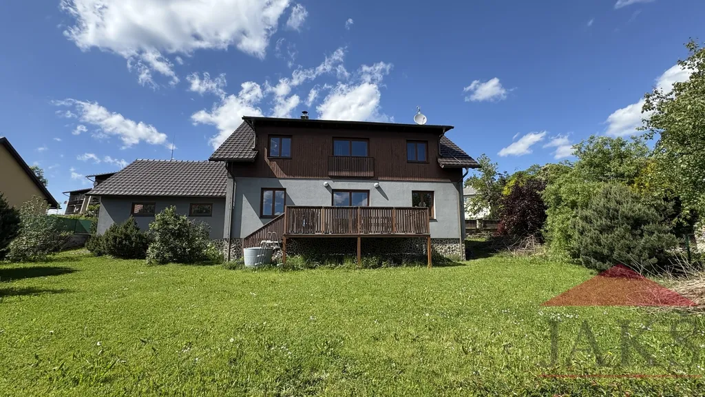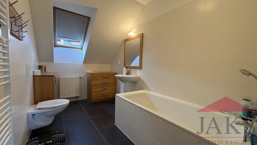 Popis: technická část: dvou-garáž (regály), technická místnost (el. boiler a elektrokotel); přízemí (81,54 m2): hala (věšáky s botníkem) se schodištěm, pracovna (stůl a skříně na míru), koupelna se saunou (sprchový kout walk-in, umyv. se zrcadlem, WC, bidet, vývody na pračku, topný žebřík), prostorný obývací pokoj s kuchyňským koutem s jídelnou (kuch linka na míru s vestavěnými spotřebiči: HV a MV trouba, sklo-ker. deska a myčka), krbovými kamny a vstupem na dřevěnou terasu s posezením a výhledem; podkroví (80,12 m2): podesta, koupelna (vana, umyv. se zrcadlem, WC, bidet, topný žebřík), hlavní ložnice (šatní skříň) s vlastní koupelnou (vana, umyv. se zrcadlem, WC, topný žebřík) a 2x ložnice; půda. Nábytek na míru od místního truhláře je součástí prodeje, ostatní nábytek a vybavení po dohodě s majitelem.