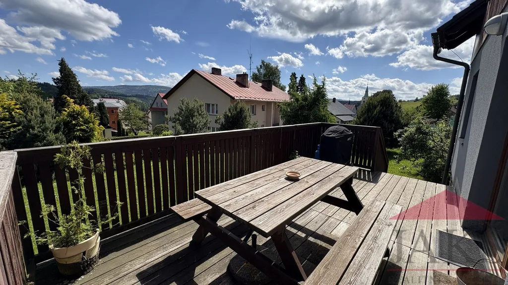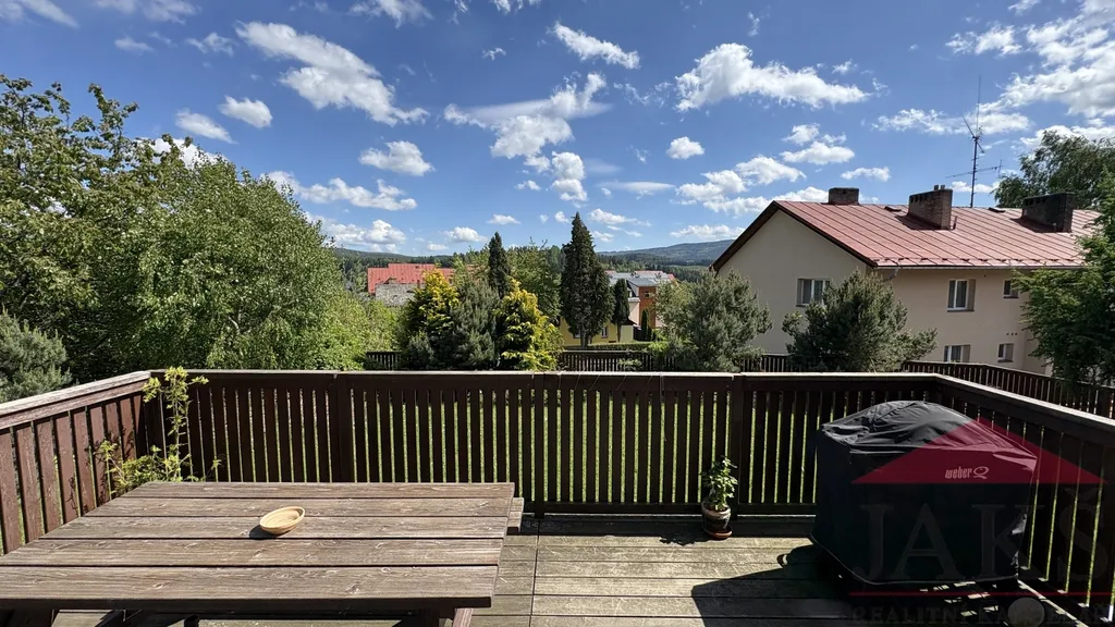 Exkluzivně vám nabízíme na prodej zateplenou zánovní novostavbu rodinného domu (5+kk s terasou; 3 koupelny; sauna; podl. pl.: 162 m2; kolaudace 2011) s dvou-garáží, úžasným výhledem a oplocenou pěstěnou zahradou 581 m2 se vzrostlou okrasnou zelení, zaručující dostatek soukromí, stojící v památkové zóně v klidné části ul. Karlova a přitom pár min. chůze z náměstí v královském městě Kašperské Hory (730 m.n.m.) v CHKO Šumava.